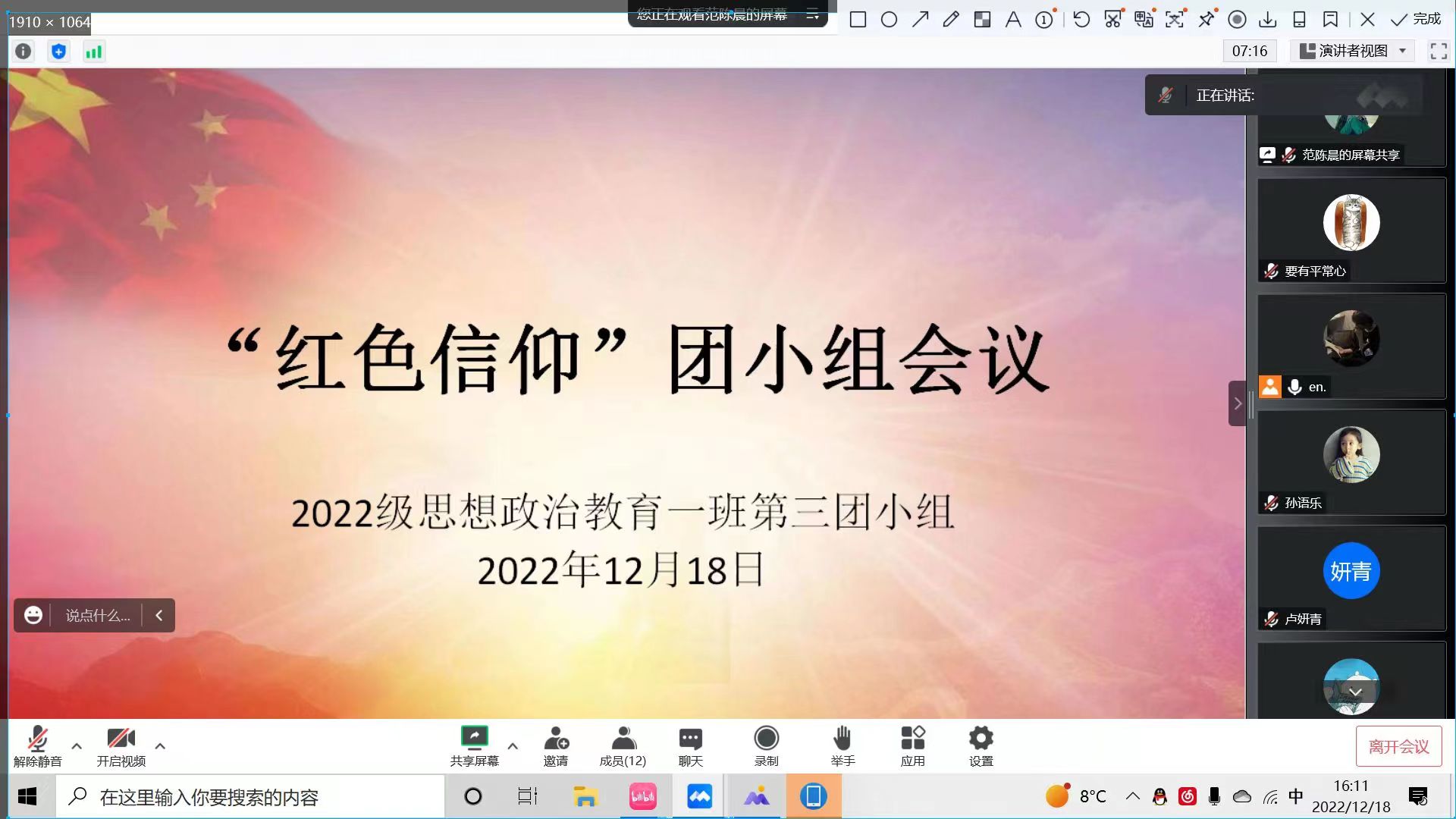 为加强团员党的理论学习,坚定红色信仰,12月18日下午,金年会jinnianhuicom2022级思想政治教育一班团员在线上召开“红色信仰”团小组会议。2022级思想政治教育一班团员参与本次会议,会议由团支部副书记闻炎仲主持。