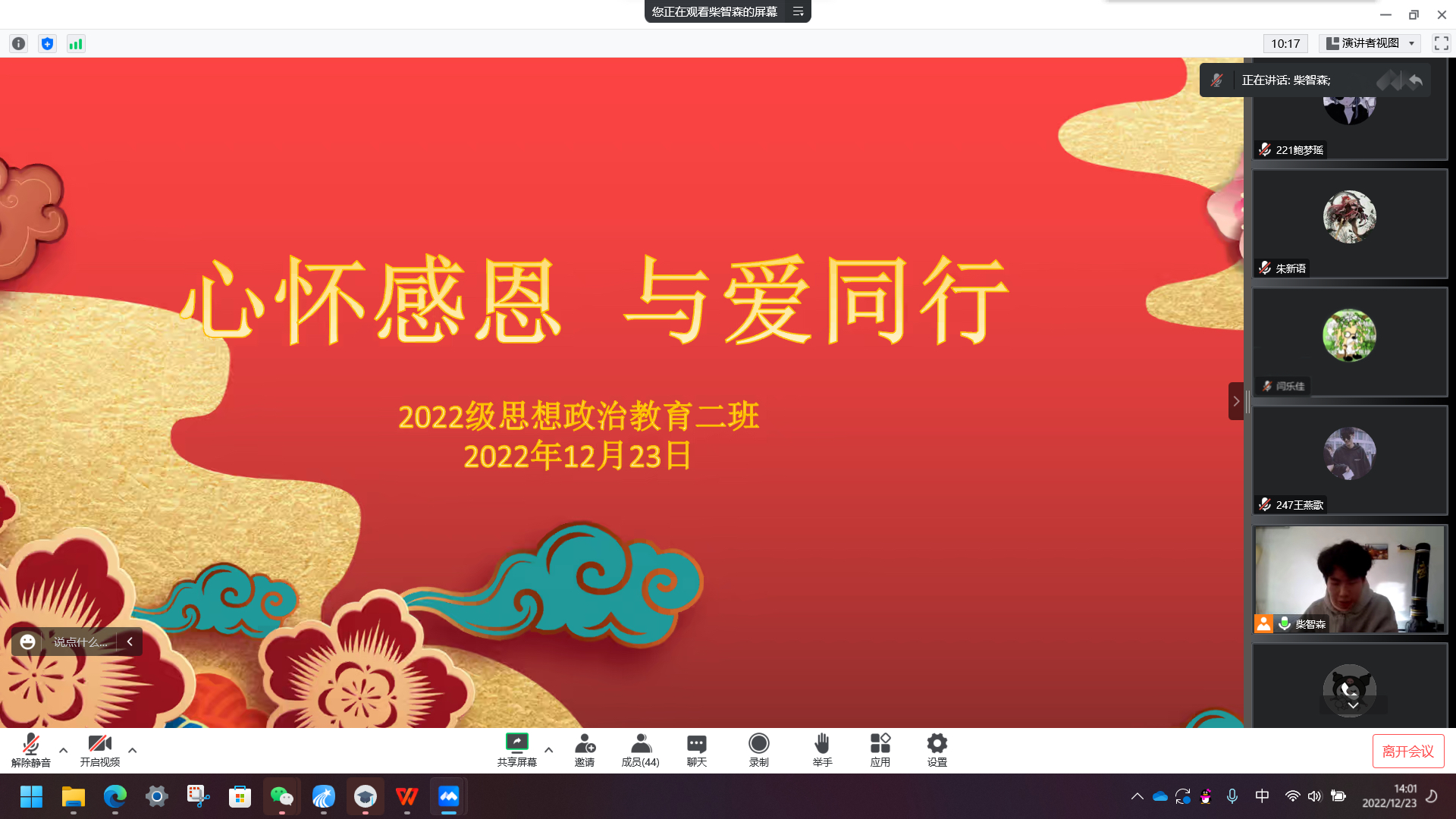 为更好贯彻“五育并举,德育为先”的教育理念,弘扬中华民族传统美德,12月23日下午,金年会jinnianhuicom2022级思想政治教育二班于线上召开“心怀感恩 与爱同行”主题班会。2022级思想政治教育二班全体同学共同参加会议。班会由副班长柴智森主持。