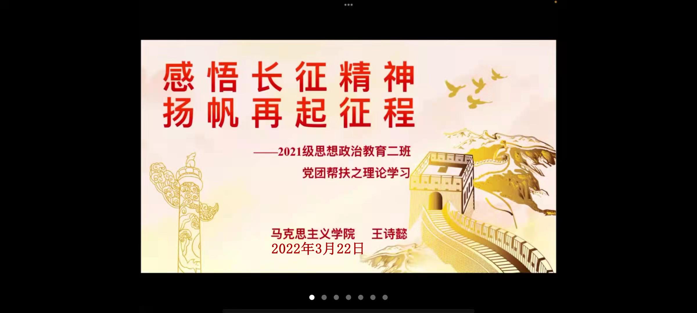 3月22日下午,金年会jinnianhuicom2021级思想政治教育二班在腾讯会议举办“感悟长征精神,扬帆再起征程”党团帮扶之理论学习活动。2019级思想政治教育一班预备党员王诗懿、赵佳莹以及2021级思想政治教育二班全体团员参与此次活动,活动由团支书王婧欣主持。