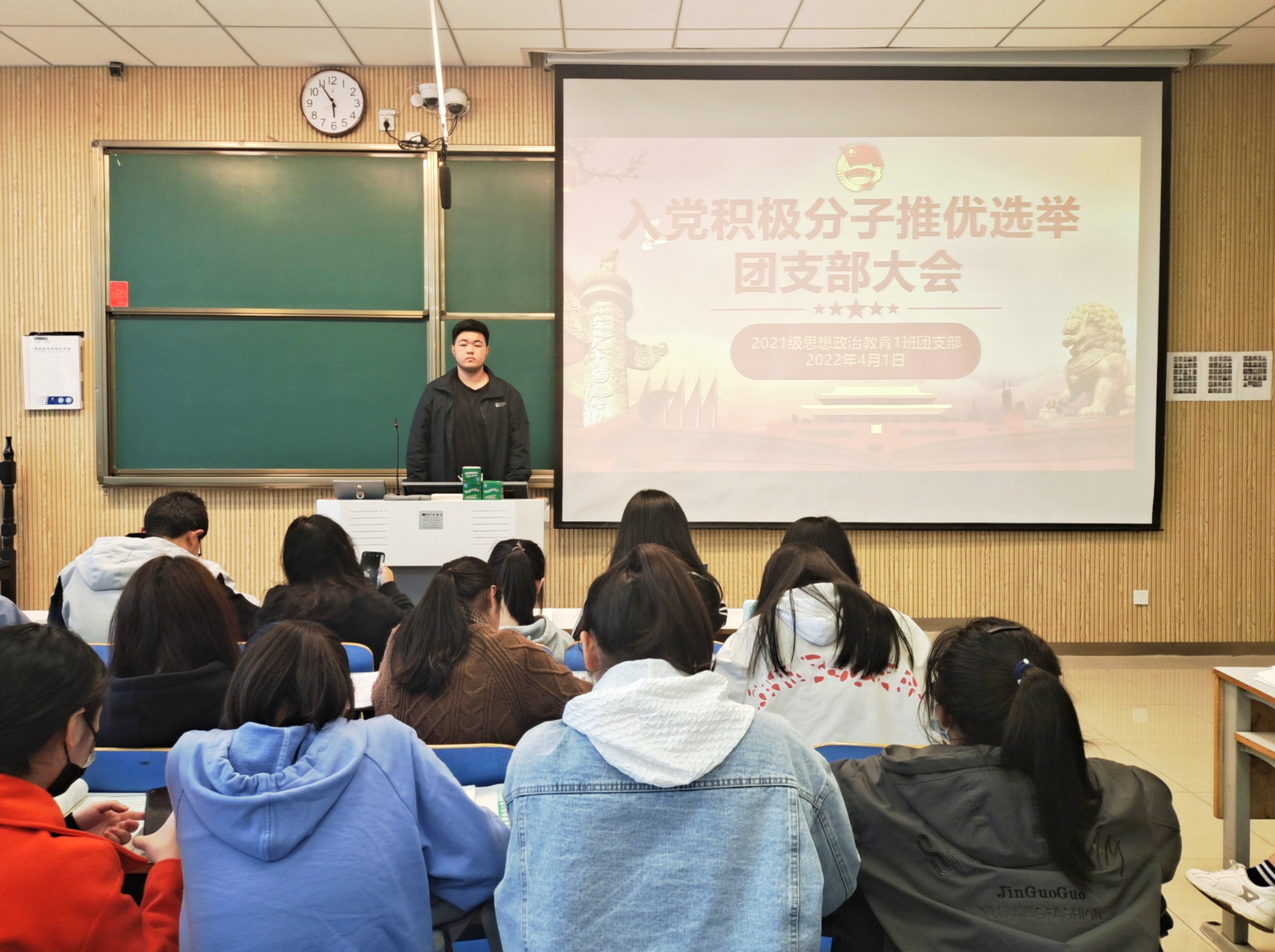 4月1日下午,金年会jinnianhuicom2021级思想政治教育一班在社科楼515召开入党积极分子推优选举团支部大会。2021级思想政治教育一班全体团员共同参加了本次团支部大会。团支部大会由团支书戴翰林主持。