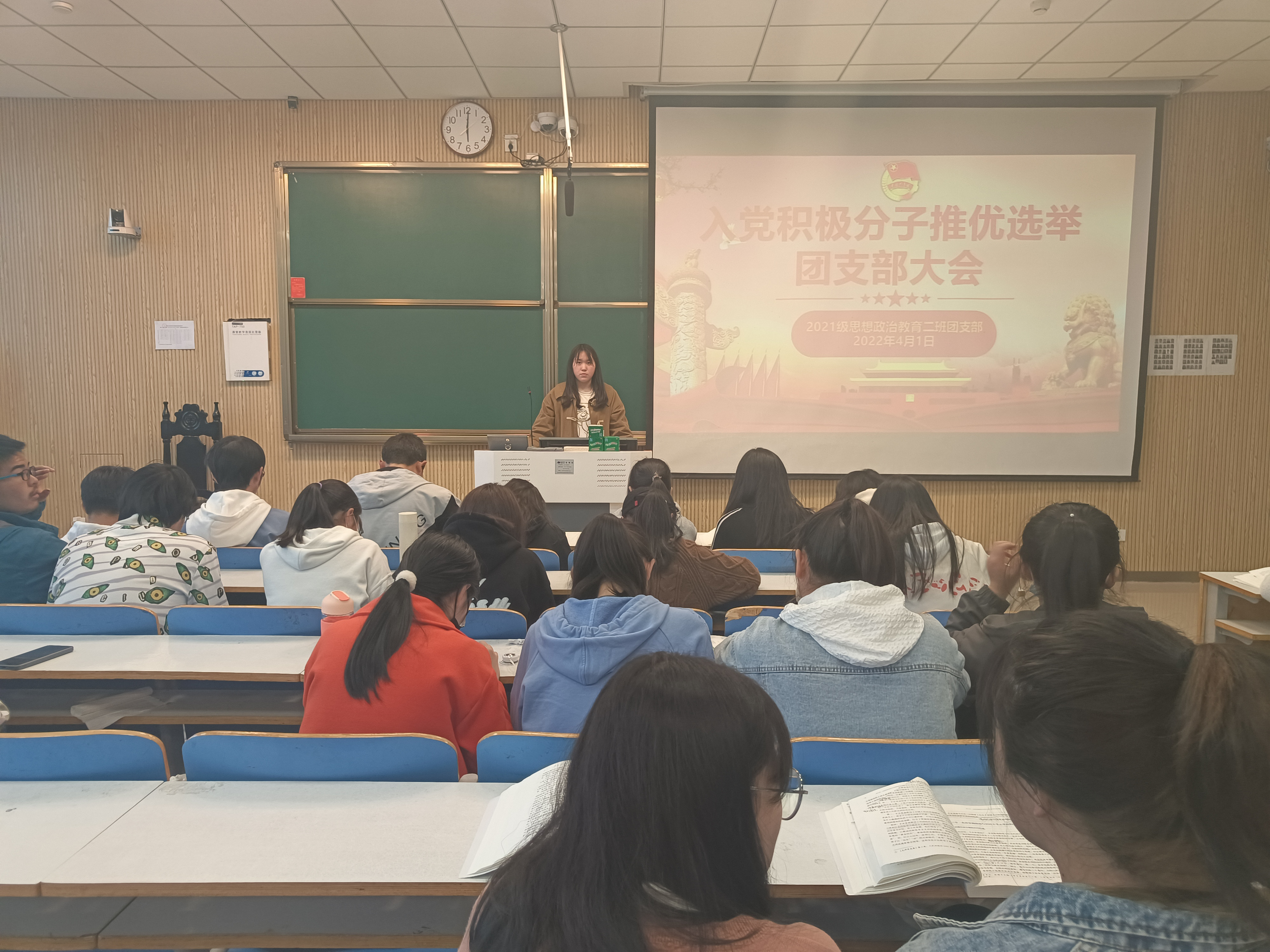 4月1日下午,金年会jinnianhuicom2021级思想政治教育二班在社科楼515教室召开入党积极分子推优选举团支部大会。2021级思想政治教育二班全体团员参与此次团支部大会,团支部大会由团支书王婧欣主持。