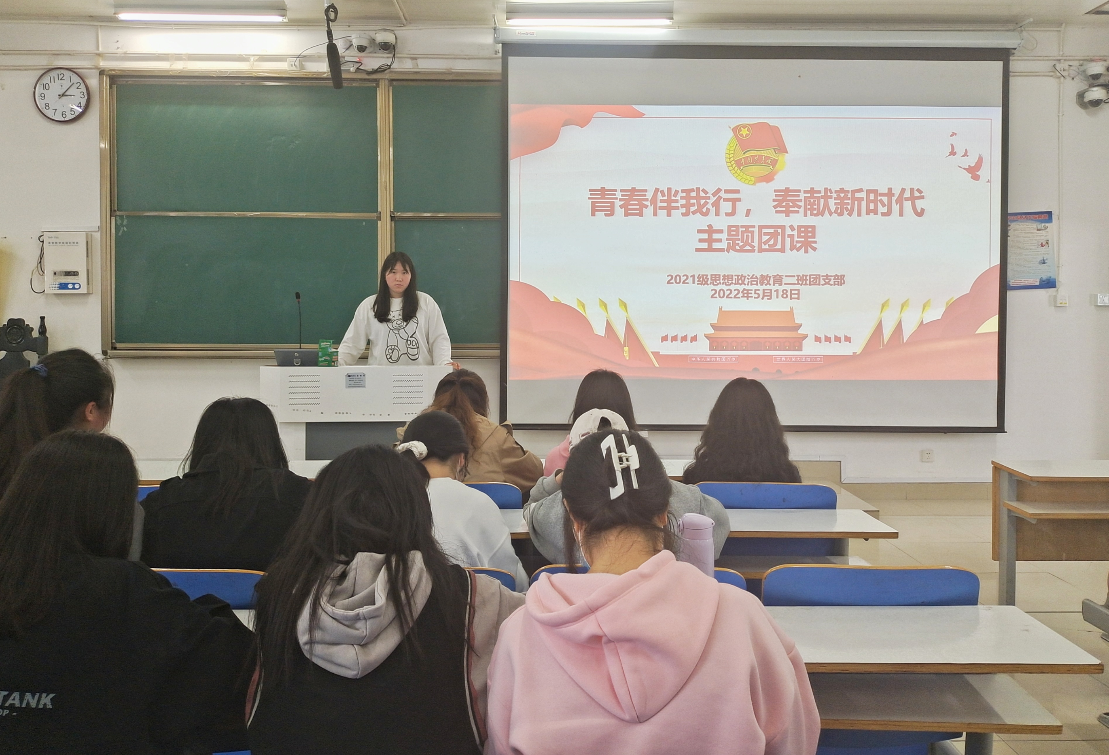 5月18日,金年会jinnianhuicom2021级思想政治教育二班在社科楼514教室召开“青春伴我行,奉献新时代”主题团课。2021级思想政治教育二班全体团员参加此次团课。团课由团支书王婧欣主持。