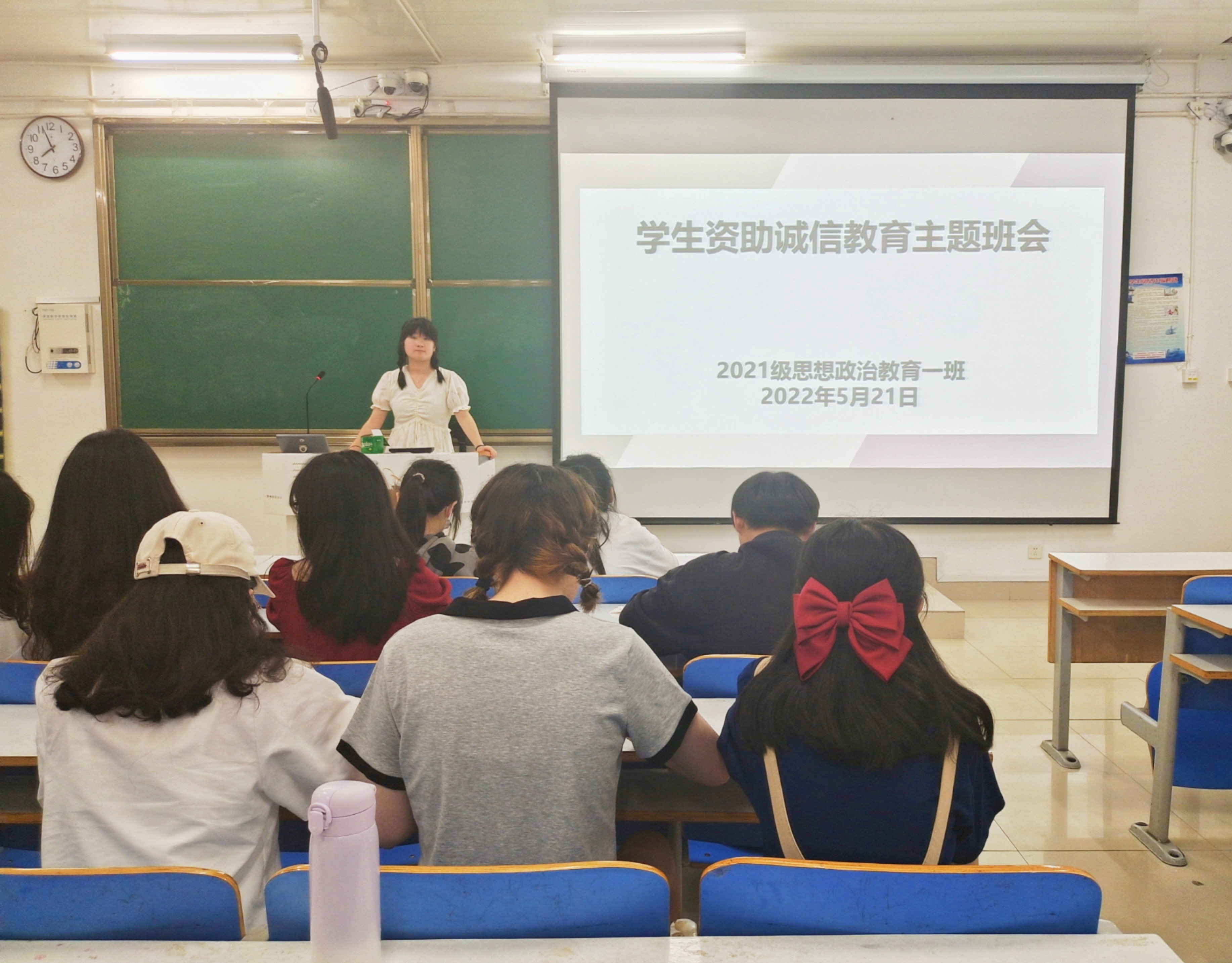 5月21日晚上,金年会jinnianhuicom2021级思想政治教育一班再社科楼516教室召开“学生资助诚信教育”主题班会。2021级思想政治教育一班全体成员共同参加了本次班会,班会由副班长雷敏主持。