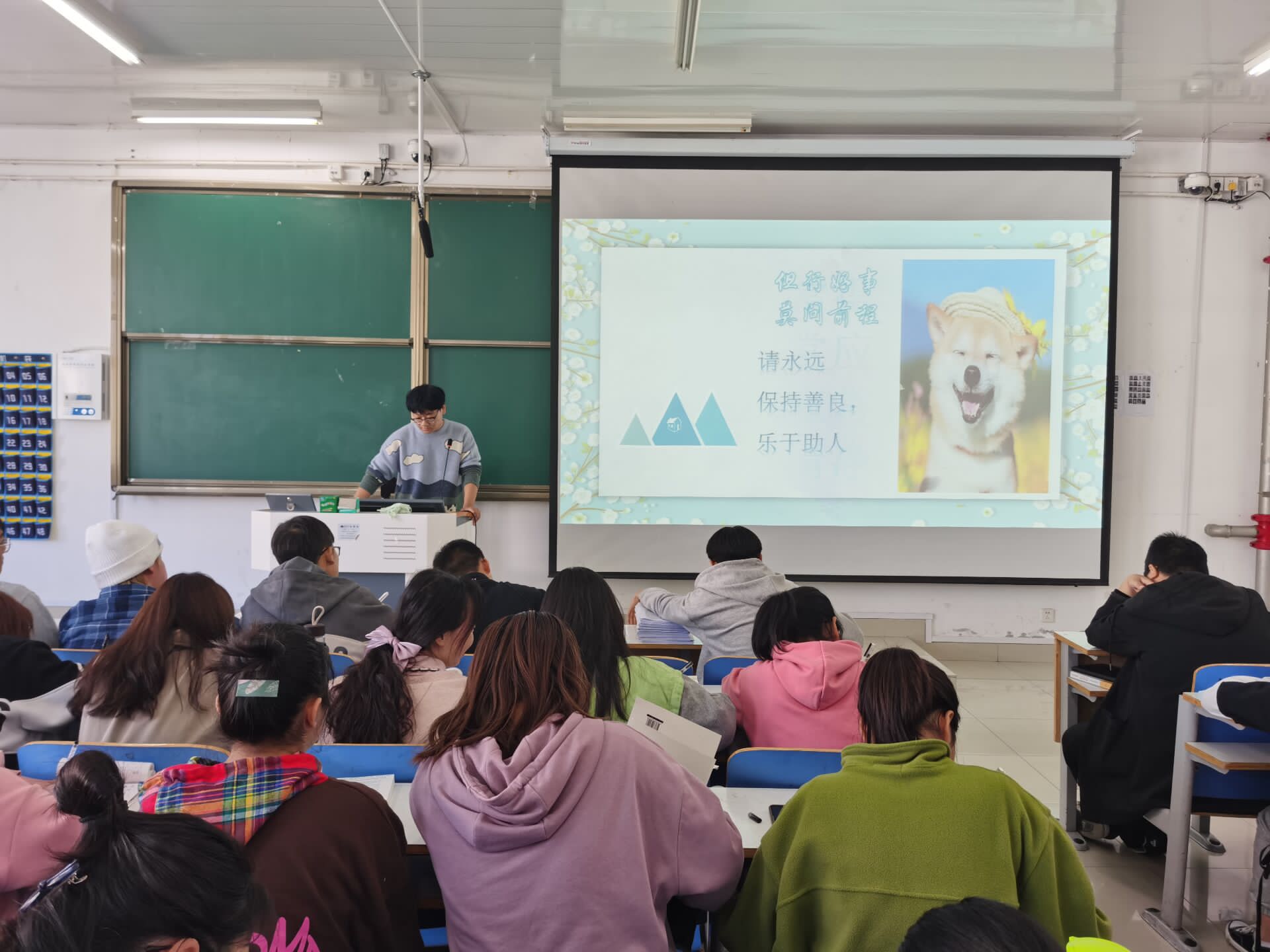 本次班会通过PPT演示、小组讨论等形式展开。班会主要分为“初见之欢、宽容待人、稳定情绪、把握时间”四个主题。首先,王旭与大家进行沟通交流并分享了自己的心路历程,并以自己的亲身经历代表发言。接着,他对在大学期间如何做到心理健康提出了建议。随后,同学们进行了小组讨论。最后,他强调,同学们一定要融入到集体中,调整好自己的心理状态。