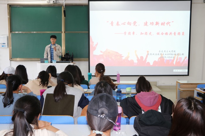 首先,靳雨通过两个小视频带领同学们学习团歌、了解团史,她指出增强团员意识教育是保持先进性的重要前提,要求同学们系统了解团的精神,充分发挥团员的先锋模范作用。接着,张国庆上台发言,提出作为一名优秀的共青团员应当认真学习专业知识,提升自身的思想道德修养和科学文化修养,积极培育和践行社会主义核心价值观。魏子航以身边同学为例向同学们讲述一位不忘初心的女孩努力实现梦想的故事,鼓励同学们努力学习新知识,提升自身能力,做一名优秀的共青团员。最后,靳雨进行发言总结,她认为作为当代大学生和共青团员应当积极学习他人身上的闪光点,从不同层面完善发展自身。