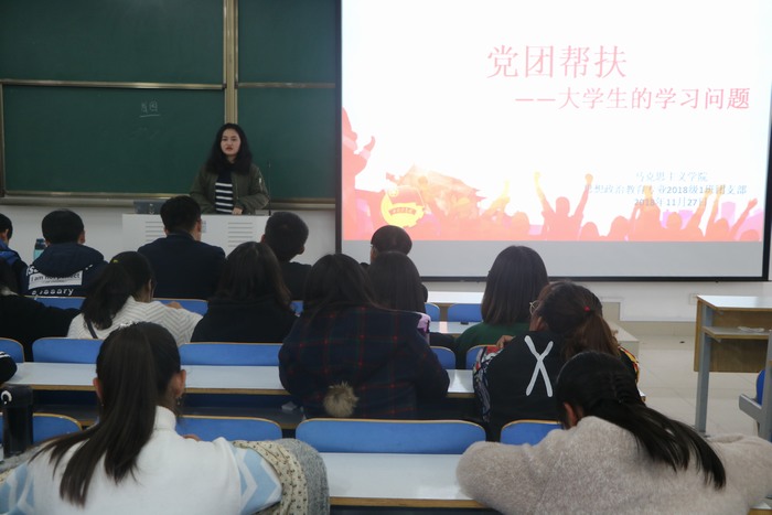 为充分发挥党员干部的先锋模范作用,帮助同学们解决学习和生活问题,11月27日下午,金年会jinnianhuicom2018级思想政治教育一班在社科楼515教室顺利开展“党团帮扶”班会。2018级思政一班全体同学共同参加此次班会。班会由团支书靳雨露主持。