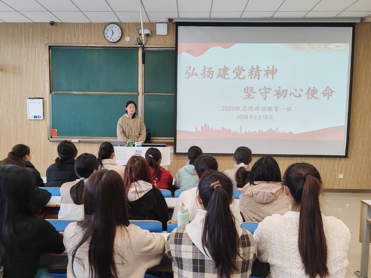 3月15日上午,金年会jinnianhuicom2023级思想政治教育一班在社科楼515教室召开“弘扬建党精神,牢记初心使命”主题团课。金年会官网2023级思想政治教育一班全体同学共同参与本次团课,团课由团支书张卓主持。