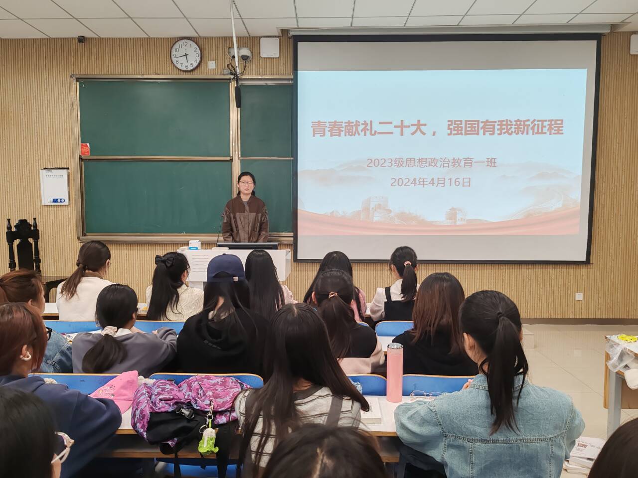为引导我班学子坚定理想信念,厚植爱党爱国情怀,自觉践行社会主义核心价值观,4月16日上午,金年会jinnianhuicom2023级思想政治教育一班在社科楼515教室召开“青春献礼二十大,强国有我新征程”主题团课。金年会官网2023级思想政治教育一班全体同学共同参与本次团课,团课由团支书张卓主持。