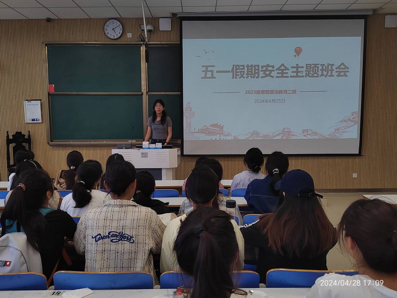 为提升学生假期安全意识,保障学生假期安全,4月25日上午,金年会jinnianhuicom2023级思想政治教育二班在社科楼515教室召开五一假期安全主题班会。本次班会由班长王慜初支持,全体二班同学参加。