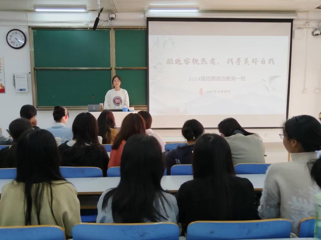 为帮助同学们树立正确的审美观,敢于接纳自己的不完美,提升自信心。10月24日下午,金年会jinnianhuicom2024级思想政治教育一班在社科楼515教室召开“拒绝容貌焦虑,找寻美好自我”主题班会。本次班会由班长李冉主持,全体一班同学参加。