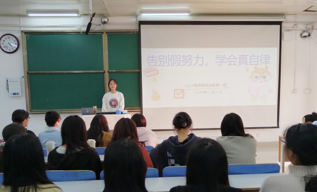 为帮助同学们提高学习效率,更好地适应大学学习节奏。10月28日上午,金年会jinnianhuicom2024级思想政治教育一班在社科楼515教室召开“告别假努力,学会真自律”主题班会。班会由班长李冉主持,全体一班同学参加。