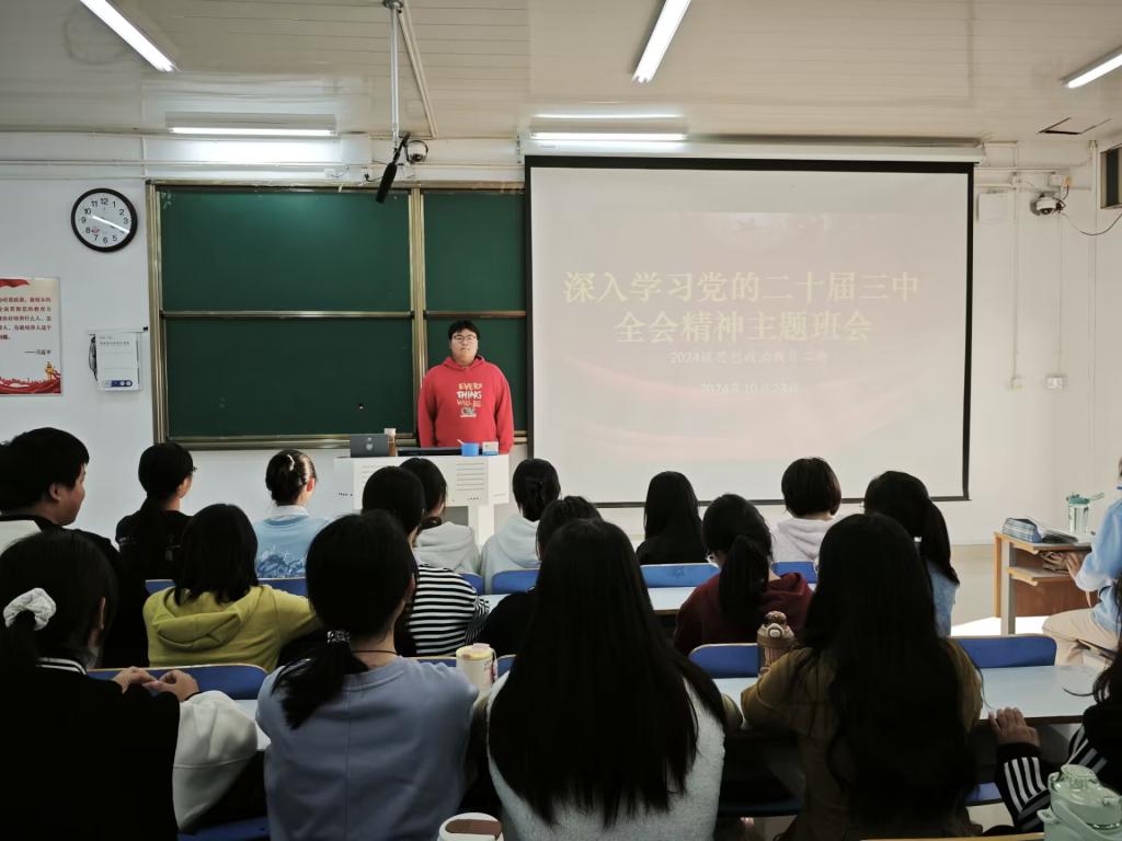 为深入学习党的二十届三中全会精神,深刻领会全面深化改革、推进中国式现代化的重大意义和战略部署,10月23日,金年会jinnianhuicom 2024 级思想政治教育二班于社科楼514教室开展了 “深入学习党的二十届三中全会精神” 主题班会。本次班会由班长王志颖主持,二班全体同学共同参与。