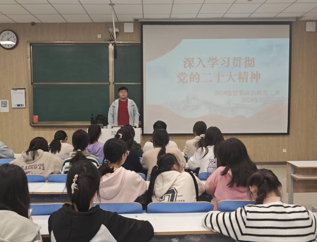 为让青年深刻领会党的二十大精神实质和丰富内涵,增强对党的路线方针政策的理解和认同,提高政治觉悟和政治能力,11月7日下午,金年会jinnianhuicom 2024 级思想政治教育二班于社科楼515教室举办了 “深入学习贯彻党的二十大精神”主题团课活动。此次团课由团支书王志颖主持,二班全体同学共同参与。