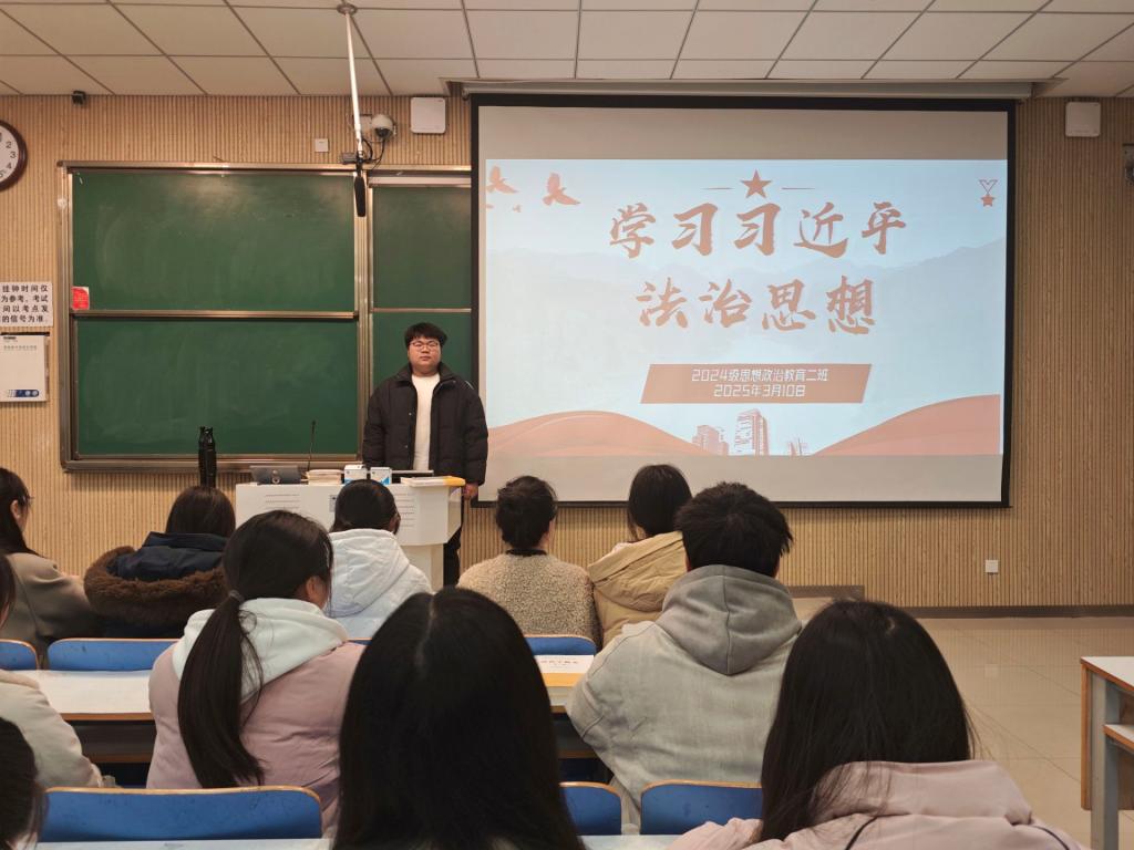 为深入学习习近平法治思想,引导学生增强法治意识,树立法治信仰,3月10日下午,金年会jinnianhuicom2024级思想政治教育二班在社科楼515教室举办了“学习习近平法治思想”主题班会。本次班会由团支书王志颖主持,二班全体同学积极参与。