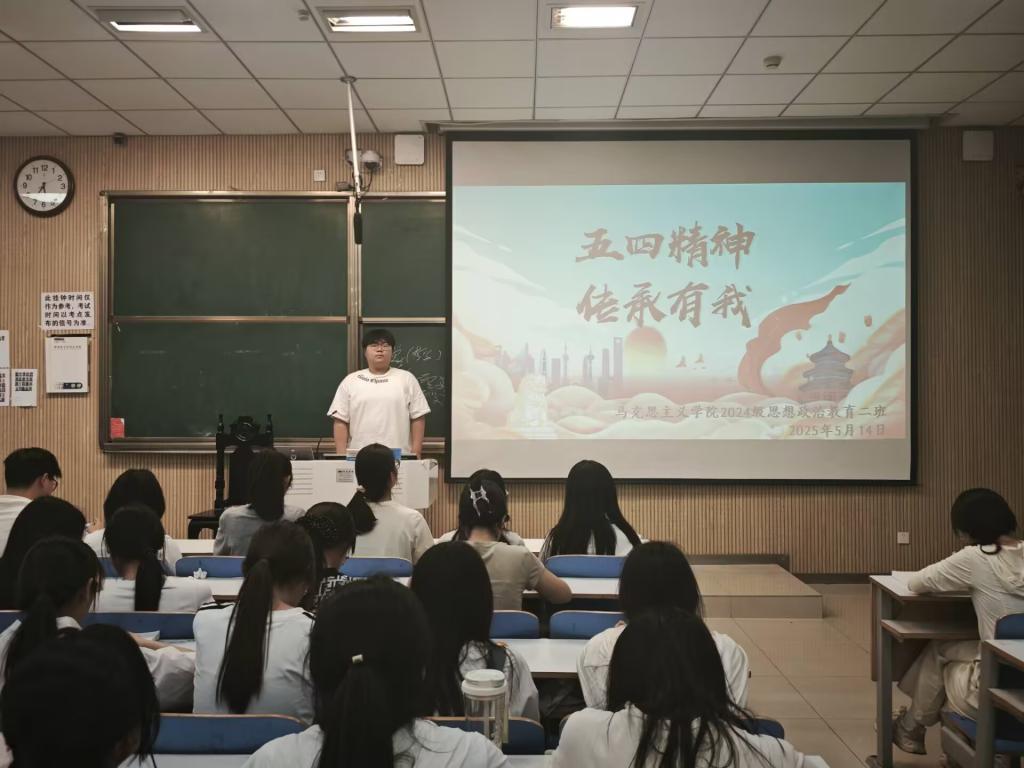 为深入学习贯彻五四精神,激励青年学生继承和发扬爱国、进步、民主、科学的优良传统,5月14日下午,金年会jinnianhuicom2024级思想政治教育二班在社科楼515教室开展了“五四精神,继承有我”主题团课。本次班会由团支书王志颖主持,二班全体同学共同参与。