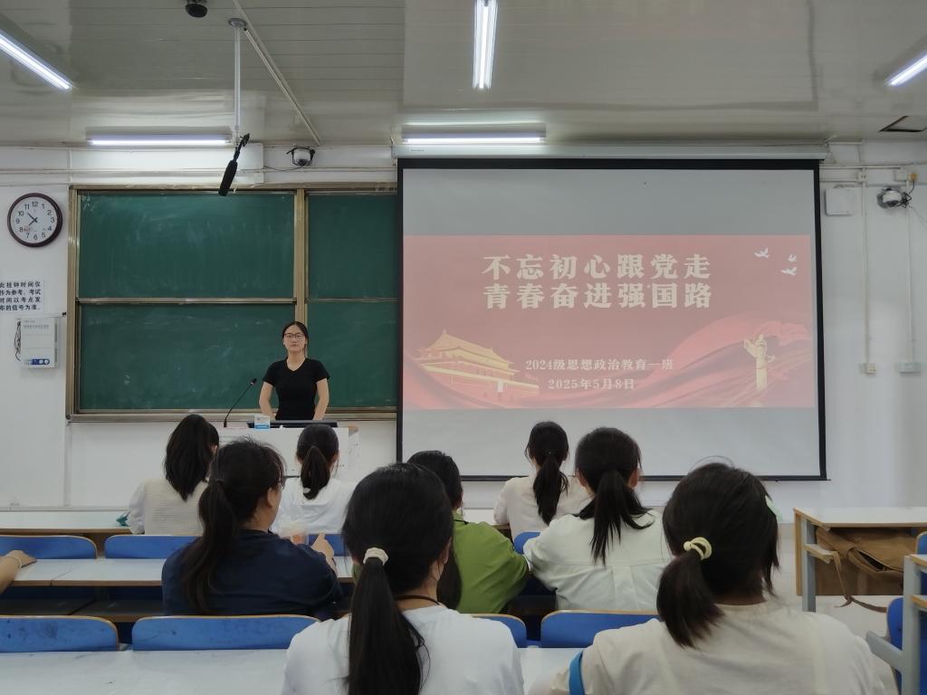 为深入学习贯彻党的二十大精神,引导青年学子坚定理想信念,勇担时代使命,5月8日上午,金年会jinnianhuicom2024级思想政治教育一班于社科楼514教室召开“不忘初心跟党走,青春奋进强国路”主题团课。本次团课由团支书李冉主持,一班全体同学参加。