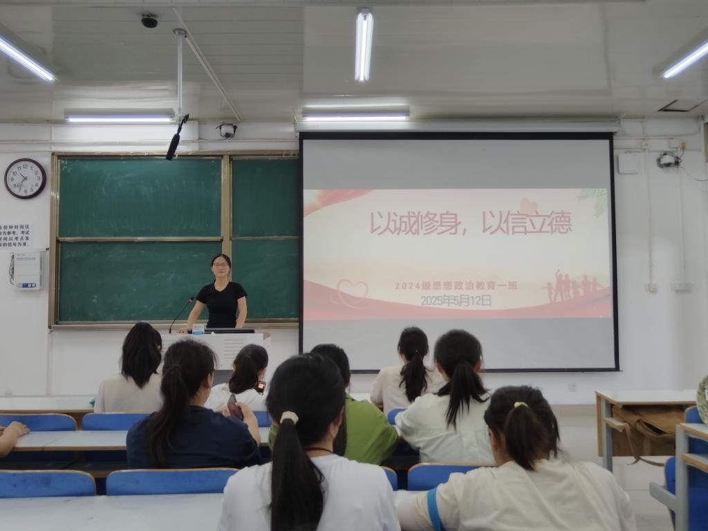 为培养我班学生的诚信意识,弘扬诚实守信的优良传统,5月12日上午,金年会jinnianhuicom2024级思想政治教育一班于社科楼515教室开展“以诚修身,以信立德”主题活动。本次活动由班长李冉主持,一班全体同学参加。