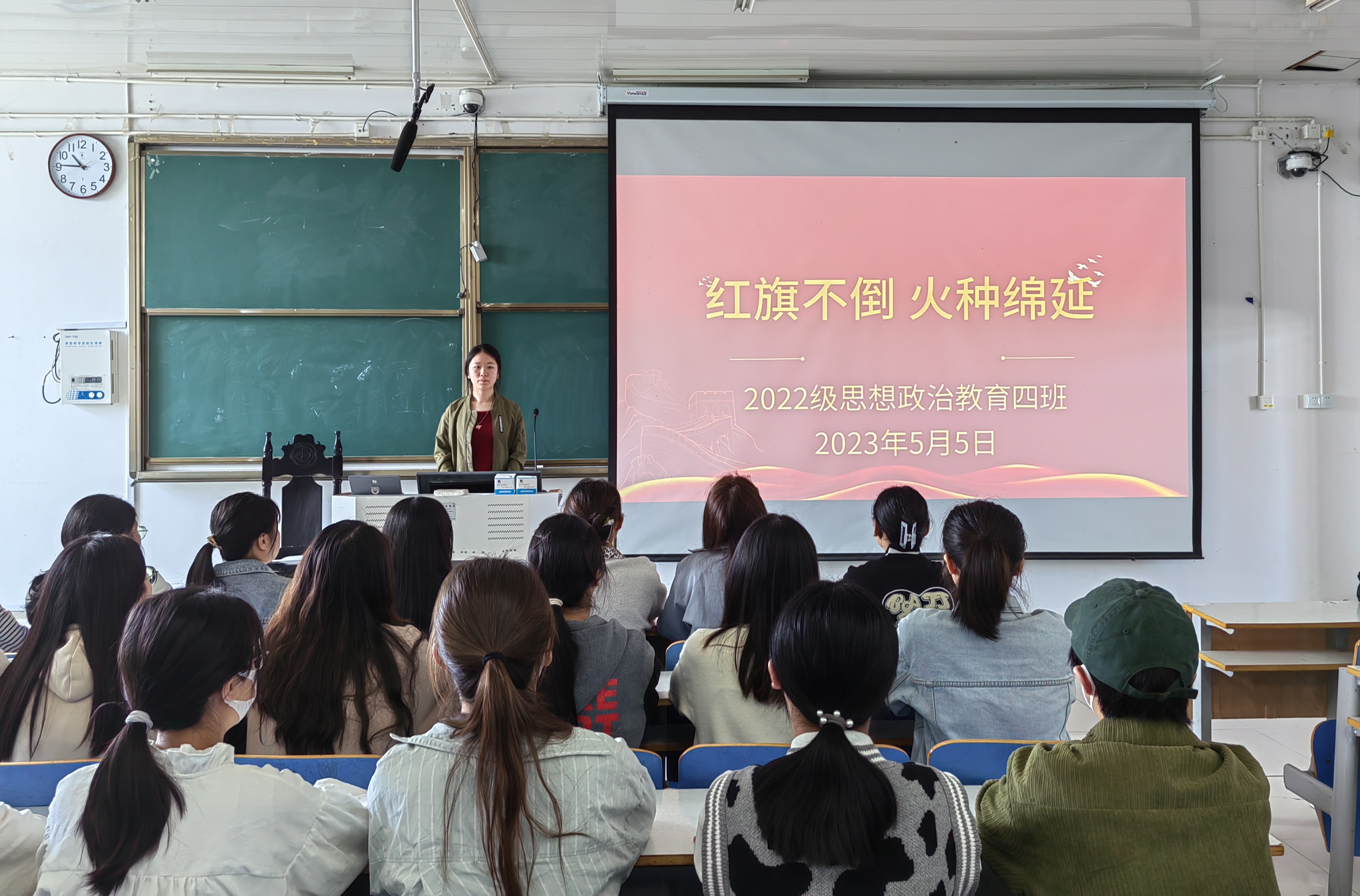 5月5日上午,金年会jinnianhuicom2022级思想政治教育四班在社科楼514教室召开“红旗不倒,火种绵延”主题团课,金年会官网2022级思想政治教育四班全体同学参与本次团课。团支书牛志杰主持团课。