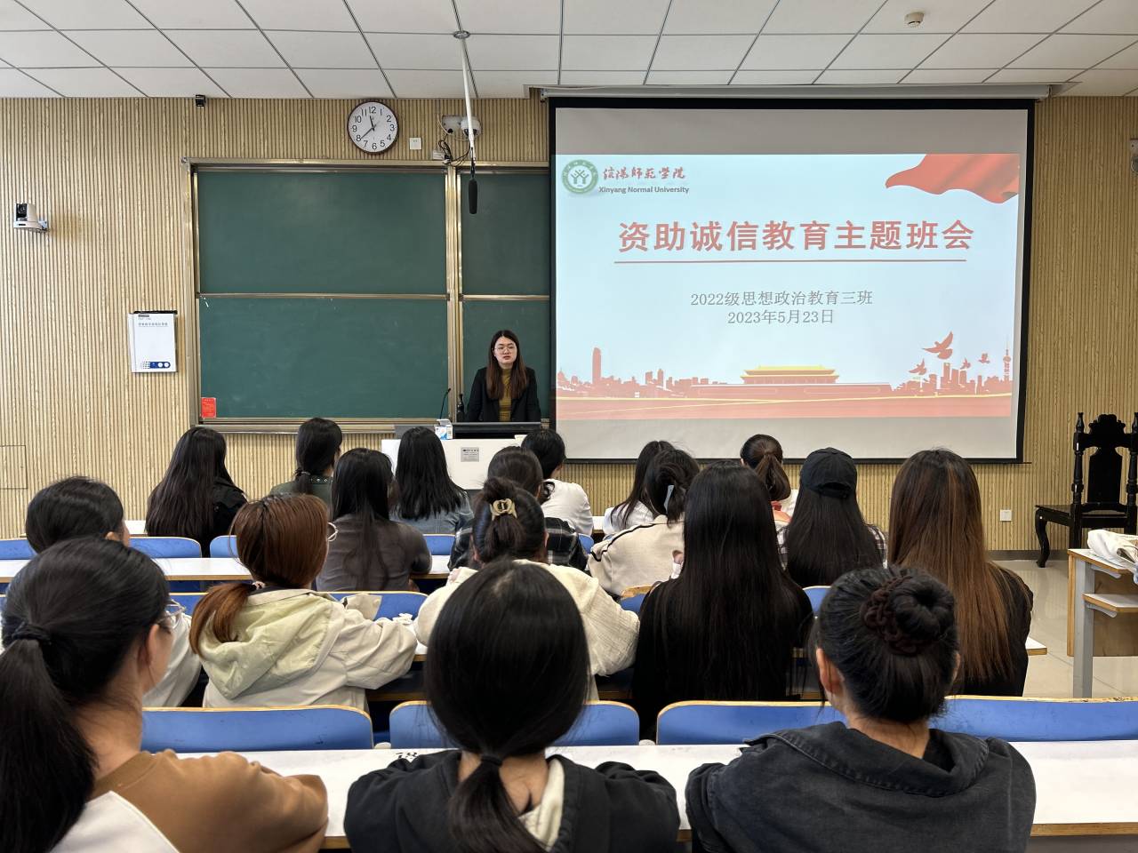 本次班会围绕政策介绍、代表发言和班会总结三个方面展开。班会伊始,雷露露指出,我校、金年会官网紧紧围绕立德树人根本任务,突出价值引领,坚持把促进家庭经济困难学生成长成才作为学生资助工作的出发点和落脚点,把资助育人融入到学生教育、管理和服务中去,切实推进资助育人工作全面展开。接着,学生代表鲁少聪发言,她指出,青年学子,在国家资助政策的支持下,要爱党爱国、不畏困难、朝气蓬勃,展现出积极进取的精神风貌和责任担当,不断为国家、社会、学校努力做出应有的贡献。最后,雷露露对三班学子提出三点要求:一是跟党走、感党恩,积极宣传党的政策方针;二是弘扬诚信、以诚化人,积极传播诚信正能量,激励广大学子诚实守信;三是怀感恩心、行美德事,积极学习科学文化知识武装自身,增本领、长才干、讲奉献。