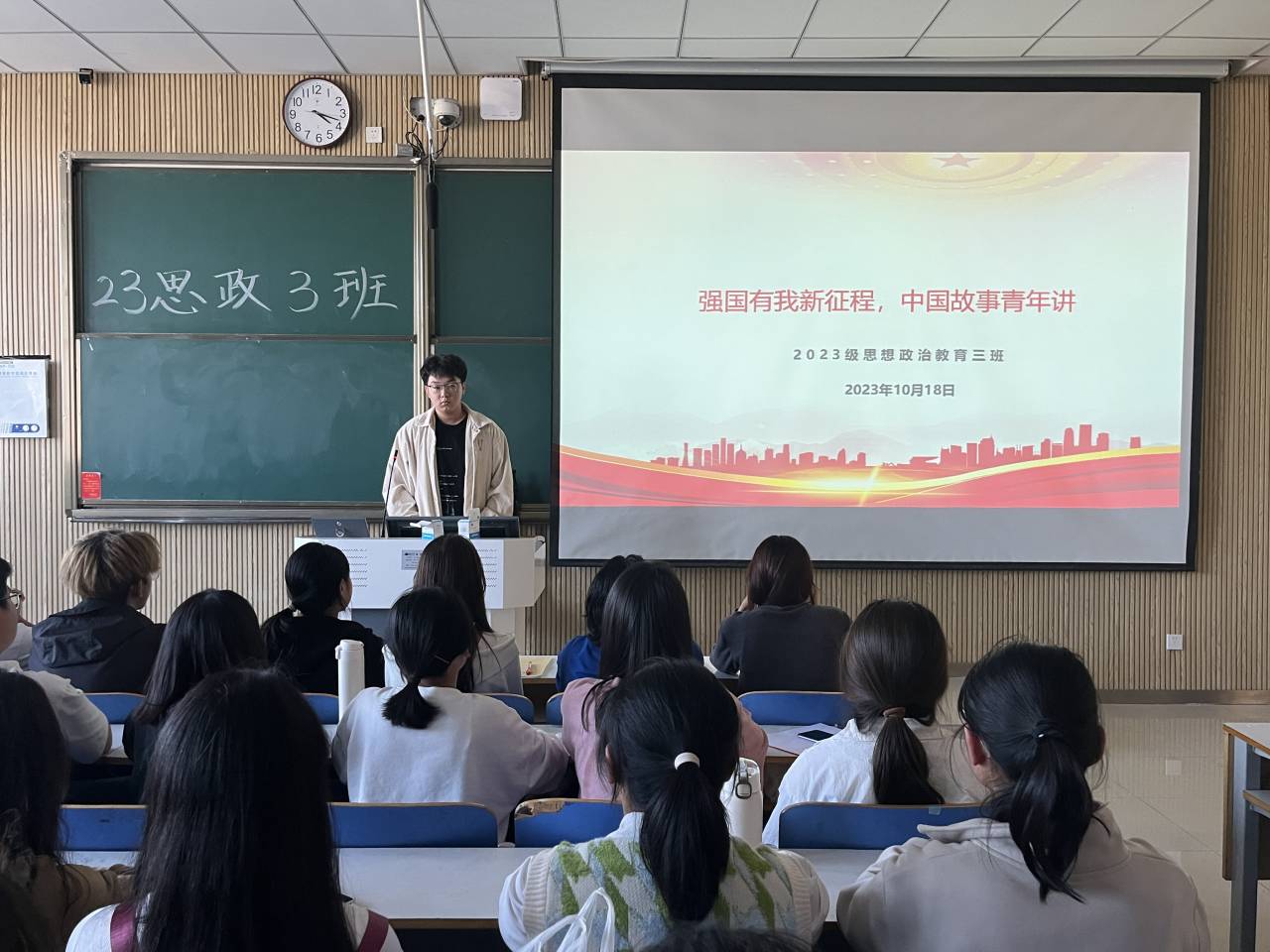 10月18日上午,金年会jinnianhuicom2023级思想政治教育三班在社科楼514教室召开“强国有我新征程,中国故事青年讲”主题团课。金年会官网2023级思想政治教育三班全体成员共同参加此次团课,团课由团支书郝瀚主持。
