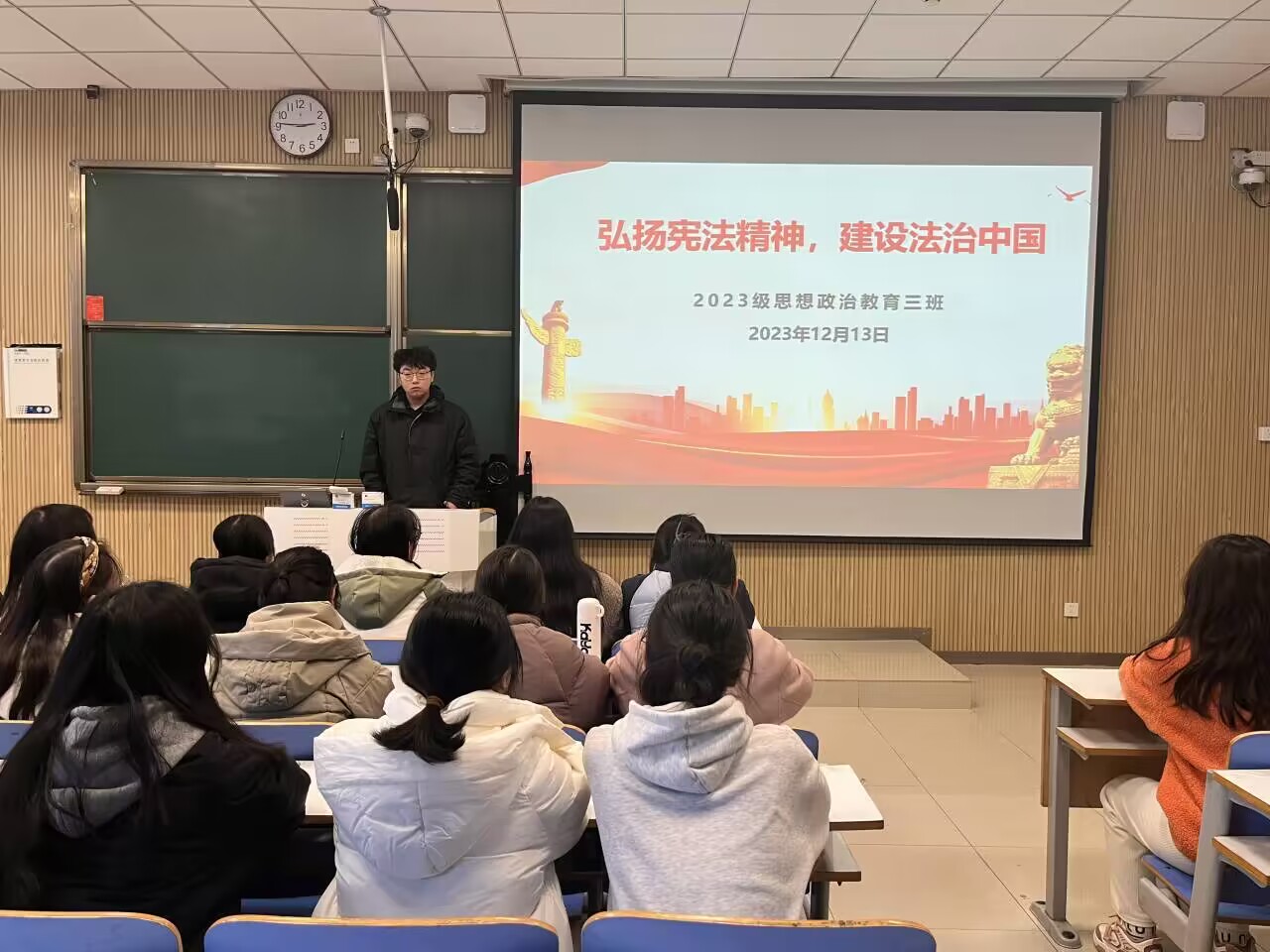 为弘扬宪法精神,维护宪法权威,12月13日上午,金年会jinnianhuicom2023级思想政治教育三班在社科楼515教室召开“弘扬宪法精神,建设法治中国”主题团课。金年会官网2023级思想政治教育三班全体成员共同参加此次团课,团课由团支书郝瀚主持。