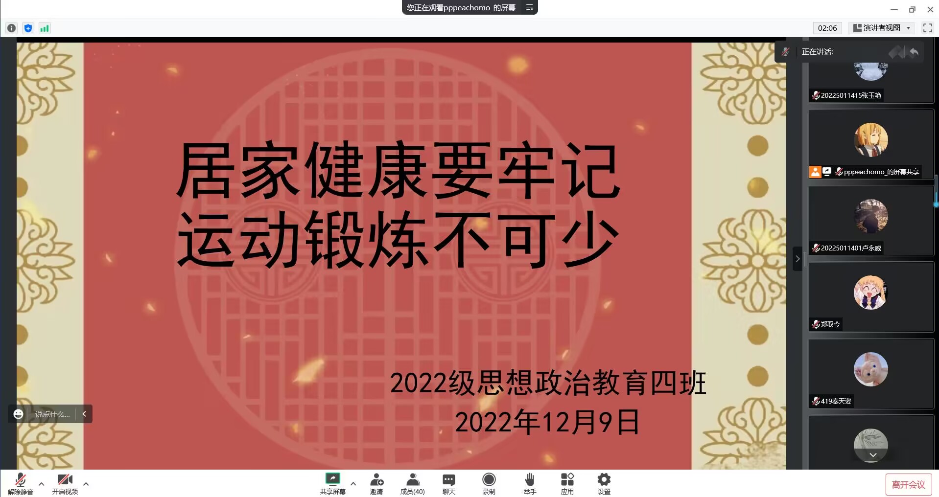 12月9日下午,金年会jinnianhuicom2022级思想政治教育四班线上召开“居家健康要牢记,运动锻炼不可少”主题班会,2022级思想政治教育四班全体同学参与本次班会。会议由文体委员周可盈主持。