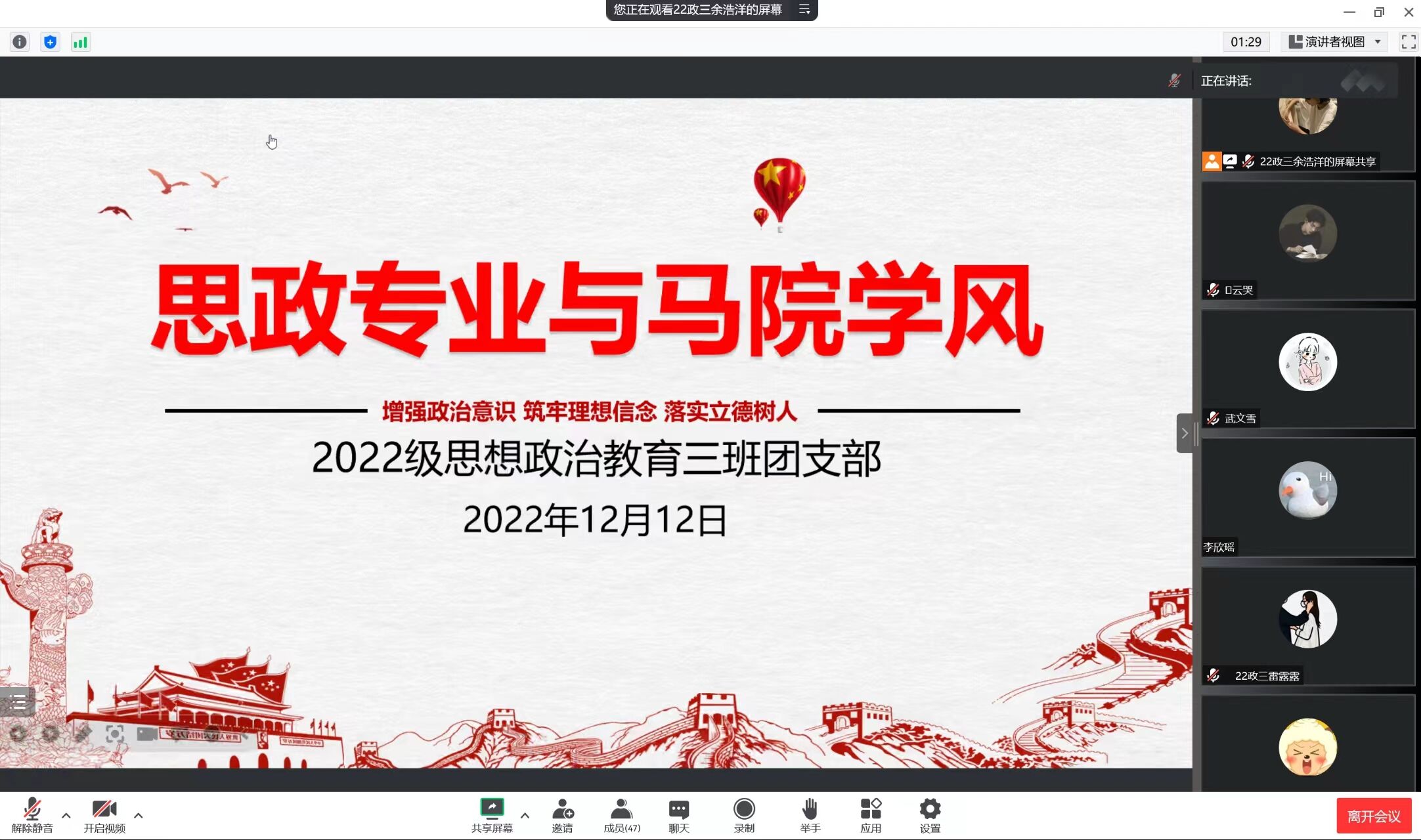 筑牢理想信念,落实立德树人。为建设创新型思政专业,打造优良的马院学风,12月12日上午,金年会jinnianhuicom2022级思想政治教育三班在线上召开“思政专业与马院学风”主题团课。2022级思想政治教育三班全体成员共同参与团课,团课由团支书余浩洋主持。