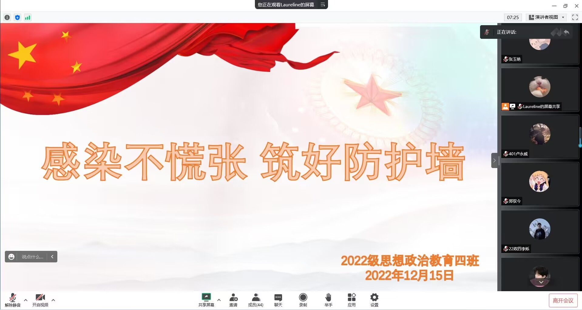 为宣传新形势下的防护政策,缓解同学们的不安情绪,12月15日下午,金年会jinnianhuicom2022级思想政治教育四班在线上召开“感染不慌张,筑好防护墙”主题班会,2022级思想政治教育四班全体同学参与本次班会。会议由班长牛志杰主持。