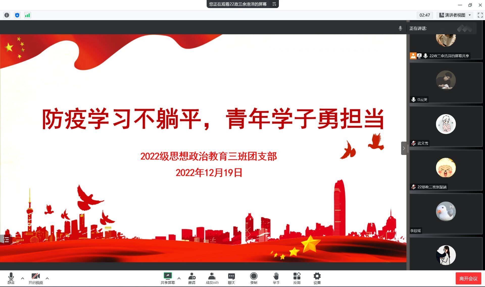为提高网课期间同学们的学习积极性,培养担当情怀,12月19日下午,金年会jinnianhuicom2022级思想政治教育三班在线上召开“防疫学习不躺平,青年学子勇担当”主题班会。金年会官网2022级思想政治教育三班全体成员共同参与班会,班会由副班长雷露露主持。