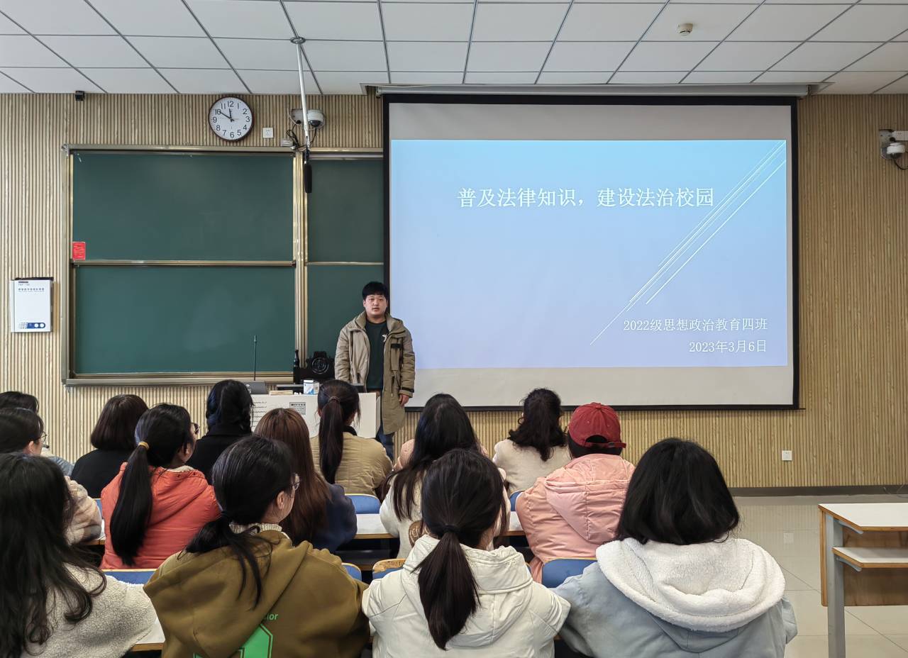 为引导同学们强化法治观念,提高守法意识,3月6日上午,金年会jinnianhuicom2022级思想政治教育四班在社科楼515教室召开“普及法律知识,建设法治校园”主题班会,2022级思想政治教育四班全体同学参加本次班会。会议由副班长宋奕铭主持。