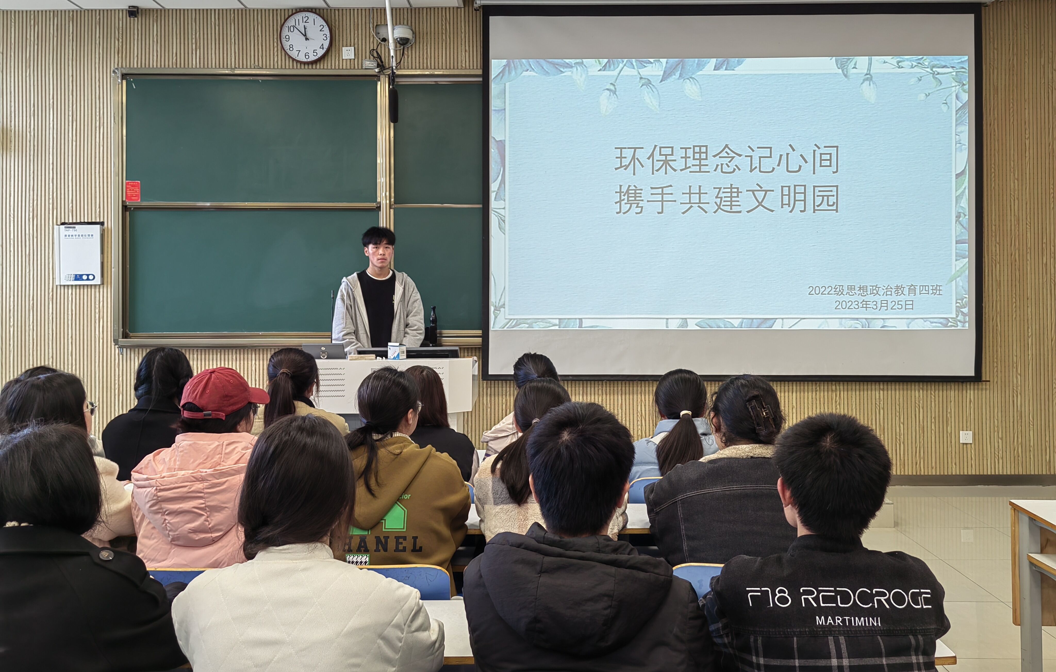 为引导同学们树立文明卫生意识,践行绿色环保生活方式,3月25日下午,金年会jinnianhuicom2022级思想政治教育四班在社科楼515教室召开“环保理念记心间,携手共建文明园”主题班会,金年会jinnianhuicom2022级思想政治教育四班全体同学参与本次班会。会议由卫生委员李烁主持。