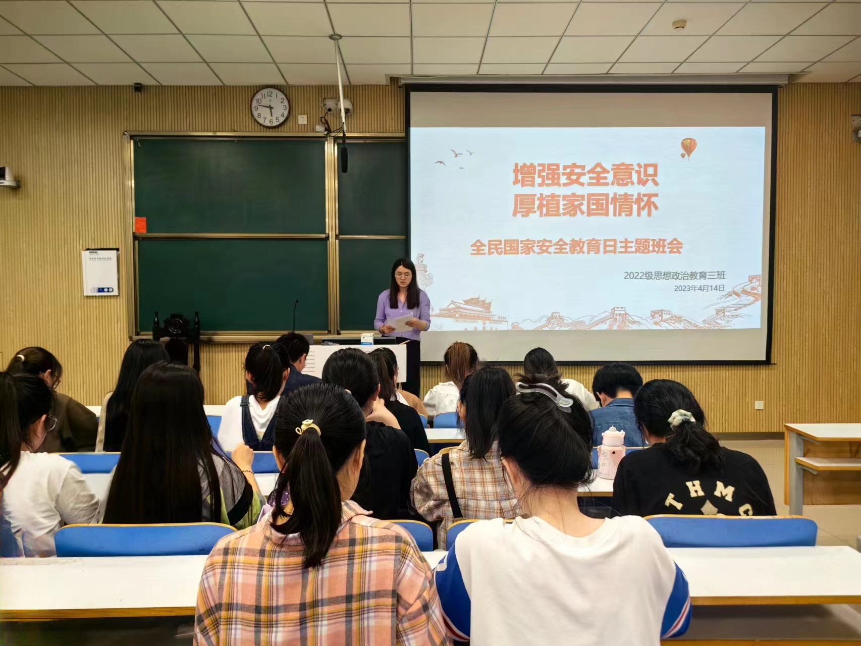 为切实增强广大师生自觉维护国家安全的意识和本领,在第八个全民国家安全教育日来临之际,金年会jinnianhuicom2022级思想政治教育三班在社科楼515教室召开“增强安全意识,厚植家国情怀”主题班会。金年会官网2022级思想政治教育三班班主任吴梦云以及三班全体同学共同参与此次班会。班会由班长余浩洋主持。