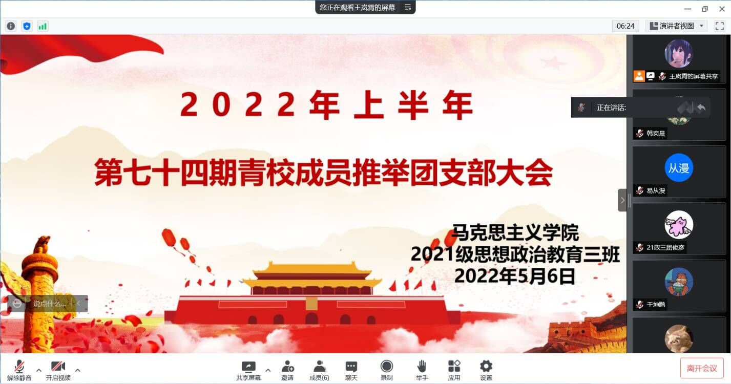 5月6日上午,金年会jinnianhuicom2021级思想政治教育三班召开线上第七十四期青校成员推举团支部大会。金年会jinnianhuicom2021级思想政治教育三班全体团员参与此次会议。会议由团支书王岚霄主持,秦梦莹担任监票员,陈笑宇担任记录员。