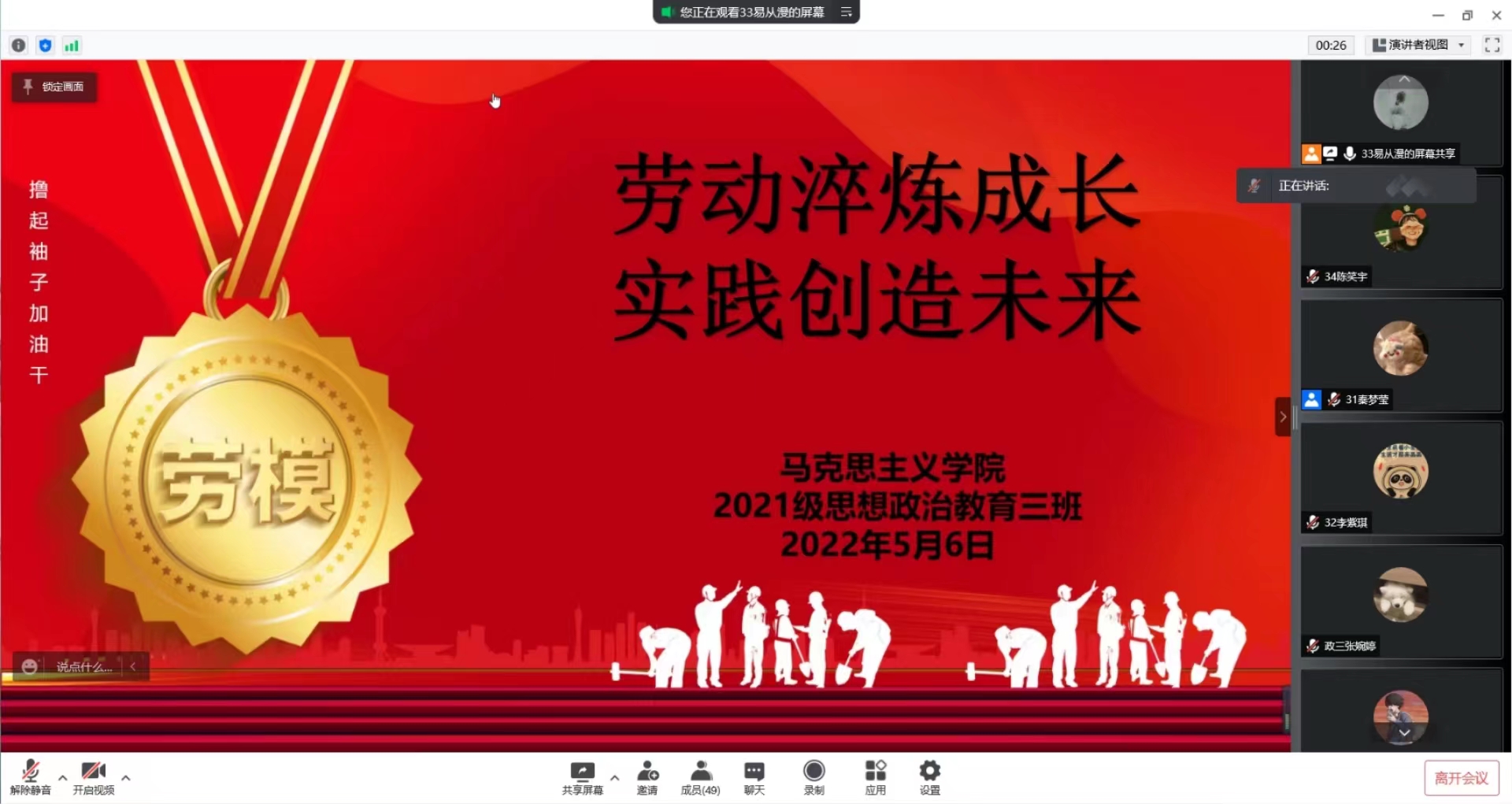 5月6日下午,金年会jinnianhuicom2021级思想政治教育三班召开线上“劳动淬炼成长,实践创造未来”主题班会。2021级思想政治教育三班全体成员参与本次会议。会议由副班长兼劳动委员易从漫主持。