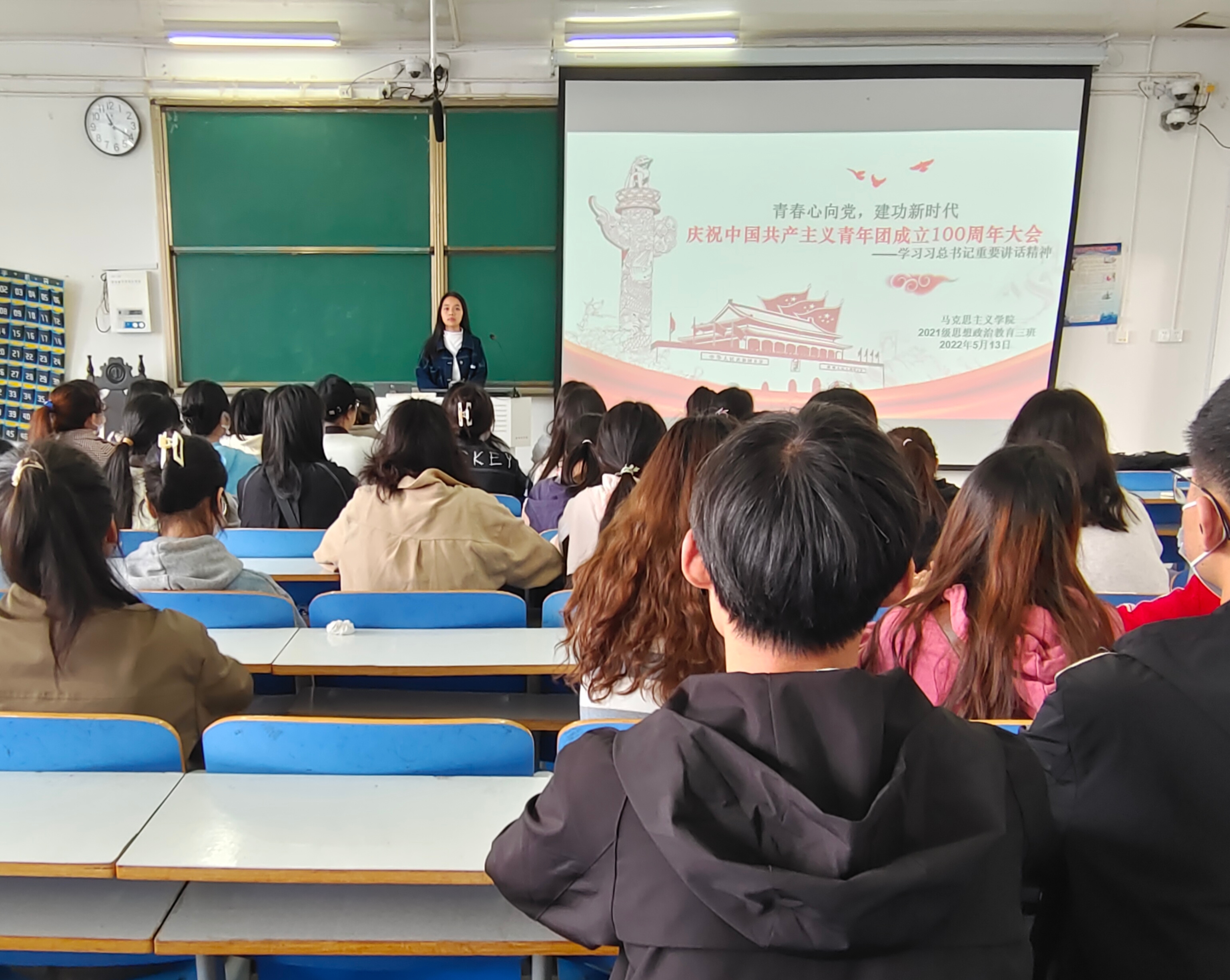 2022年,是中国共产主义青年团成立100周年,回望百年,青春向党。团课伊始,王岚霄指出,此次团课旨在引领班级团员更好地了解共青团史,争做新时代新青年。随后,她带领大家观看庆祝中国共产主义青年团成立100周年大会相关视频,并带领全体团员起立宣誓,重温入团誓词。最后,她带领大家学习了习近平总书记在庆祝中国共产主义青年团成立100周年大会上的重要讲话精神”,并鼓励全体团员坚定信念,听党话、跟党走,积极传承红色基因。
