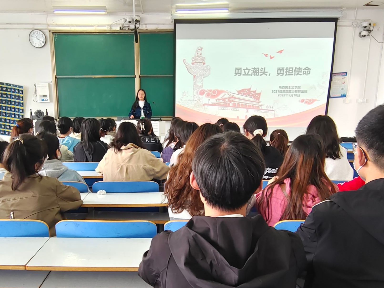5月18日上午,金年会jinnianhuicom2021级思想政治教育三班在社科楼514教室召开“勇立潮头,勇担使命”主题团课。2021级思想政治教育三班全体成员参与此次团课。团课由团支书王岚霄主持。