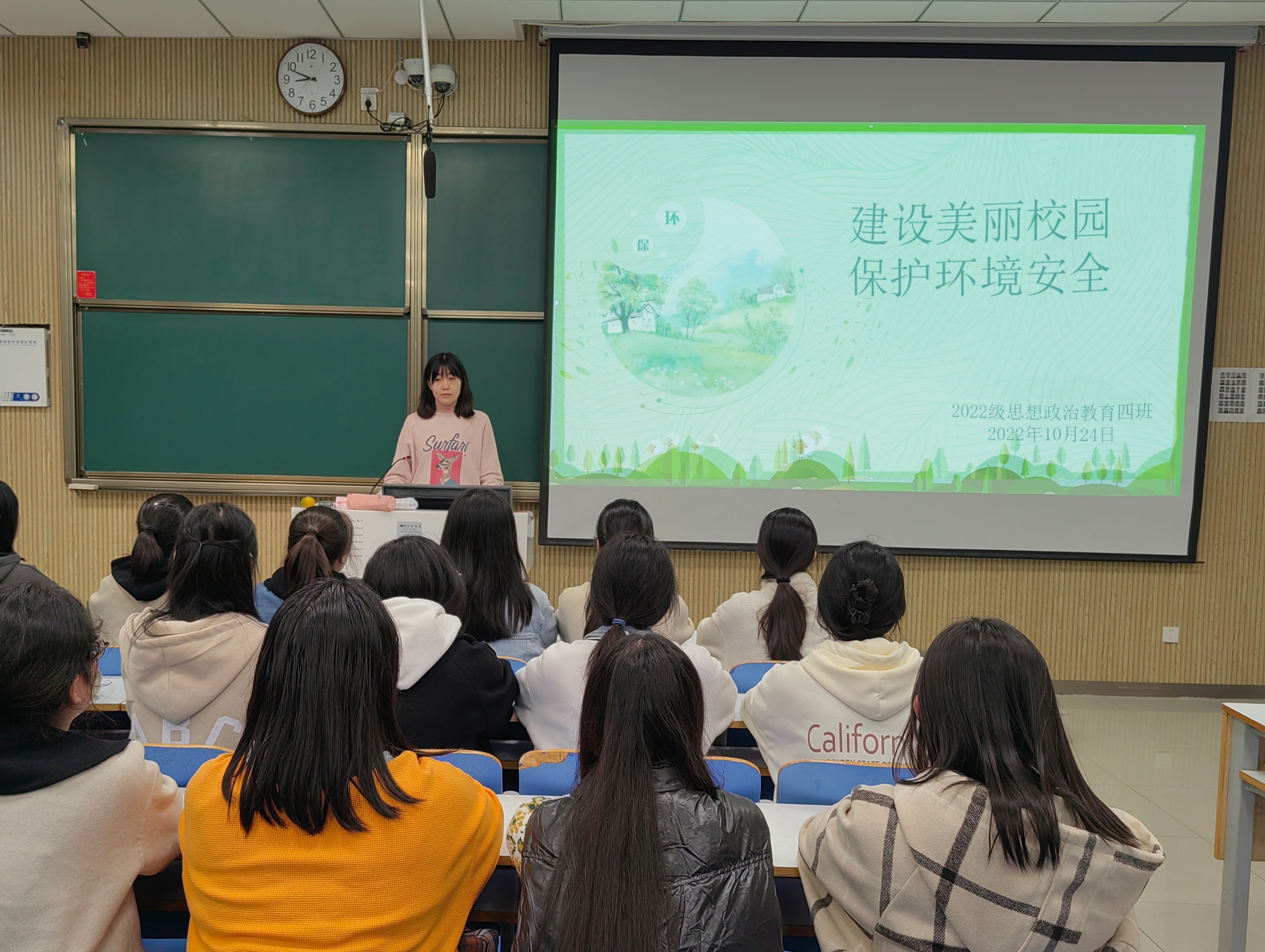 为贯彻绿色发展理念,提高同学们的环保意识,10月24日下午,金年会jinnianhuicom2022级思想政治教育四班在社科楼515教室召开“建设美丽校园,保护环境安全”主题班会。会议由文体委员周可盈主持。