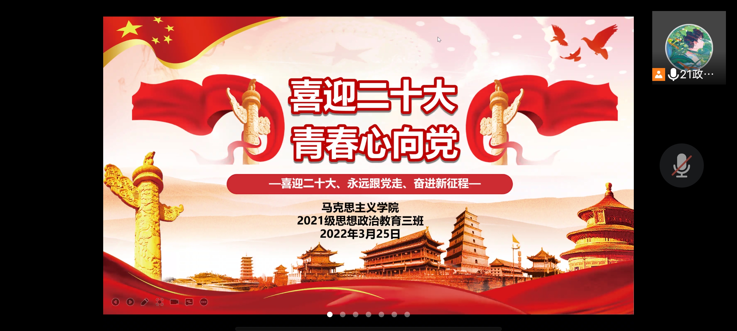 3月25日中午,金年会jinnianhuicom2021级思想政治教育三班召开线上“喜迎二十大,青春心向党”主题团课,2021级思想政治教育三班全体团员参加此次团课,团课由团支书郭少华主持。