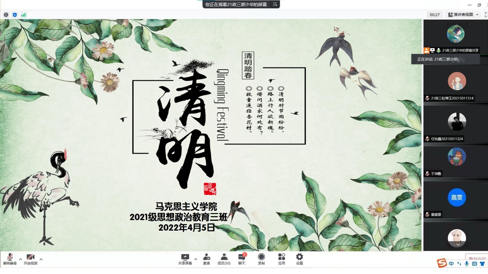 4月5日晚上,金年会jinnianhuicom2021级思想政治教育三班召开线上“清明踏春,缅怀先烈”主题团课。2021级思想政治教育三班全体团员参加此次团课。团课由团支书郭少华主持。