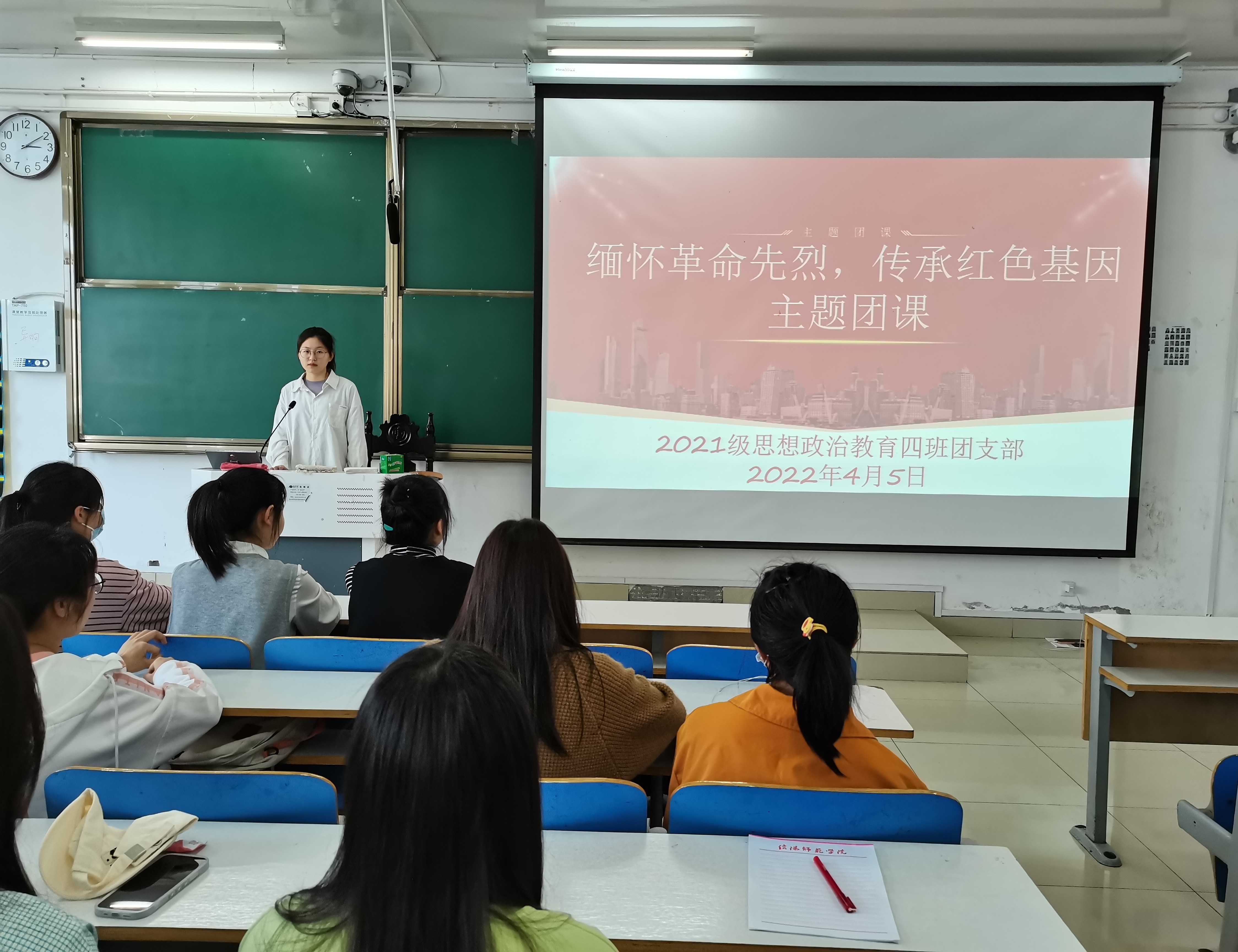 为表达对革命先烈们的崇敬和尊重,传承中华民族精神,4月5日下午,金年会jinnianhuicom2021级思想政治教育四班在社科楼516教室开展“缅怀革命先烈,传承红色基因”主题团课。2021级思想政治教育四班全体团员参加本次团课。团课由团支书刘珂含主持。