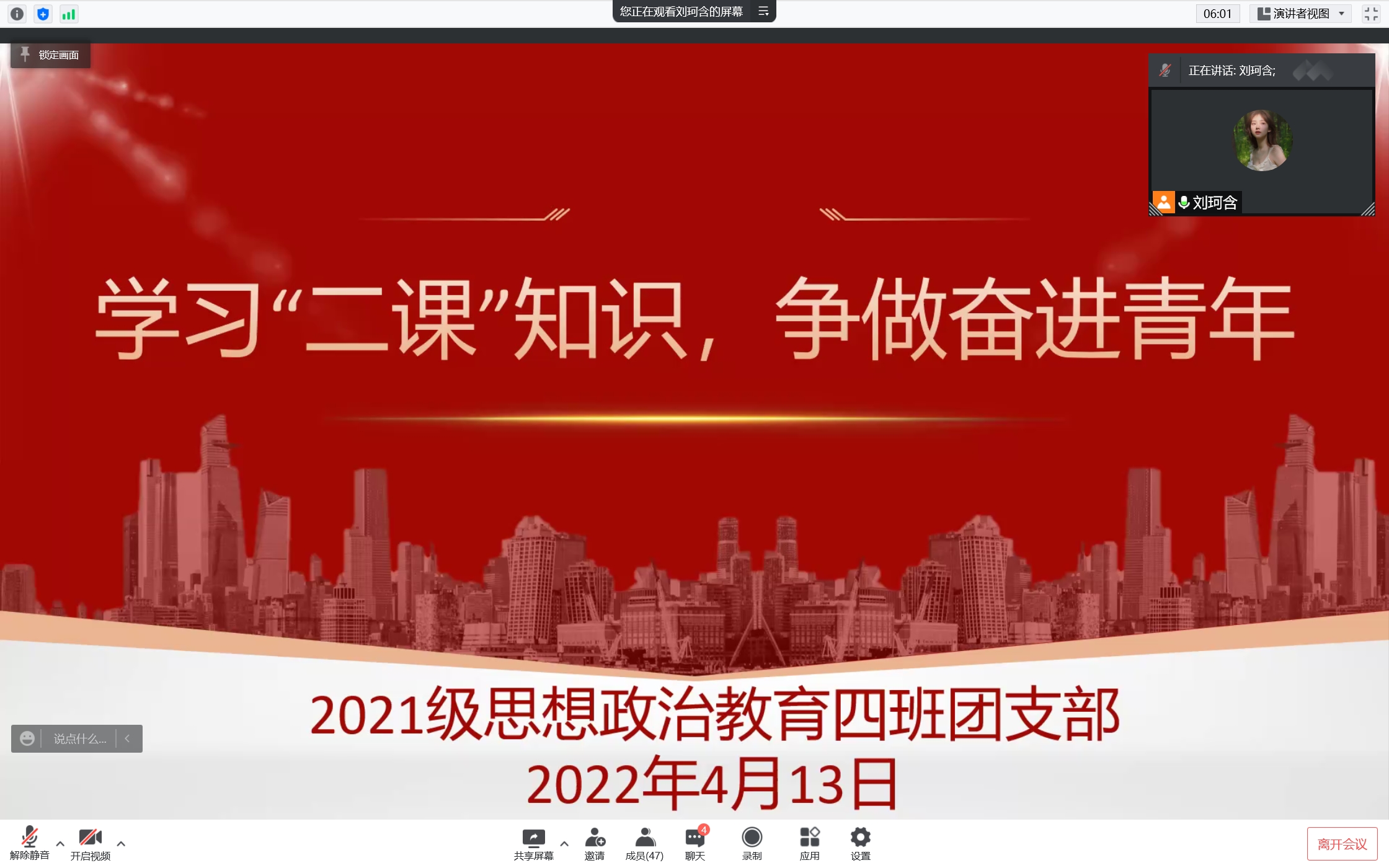 为加强学生创新创业精神和实践能力的培养,4月13日晚上,金年会jinnianhuicom2021级思想政治教育四班开展“学习二课知识,争做奋进青年”主题团课。2021级思想政治教育四班全体团员共同参与本次团课,团课由团支书刘珂含主持。