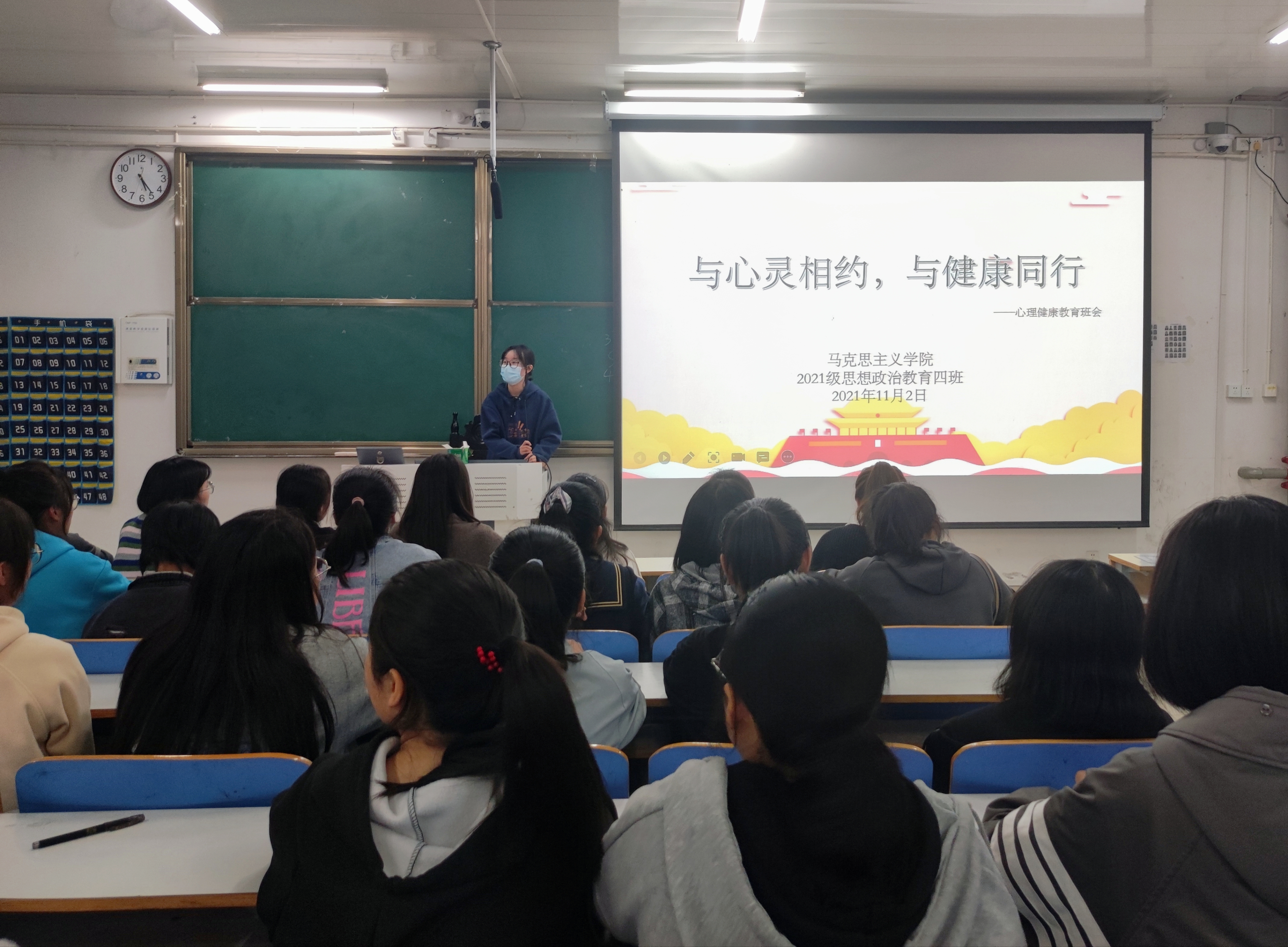 为了普及心理知识,营造班级良好氛围。11月2日上午,金年会jinnianhuicom2021级思想政治教育四班“与心灵相约,与健康同行”主题班会在社科楼516教室顺利开展。2021级思想政治教育四班全体同学参加了本次班会。班会由心理委员杨可主持。