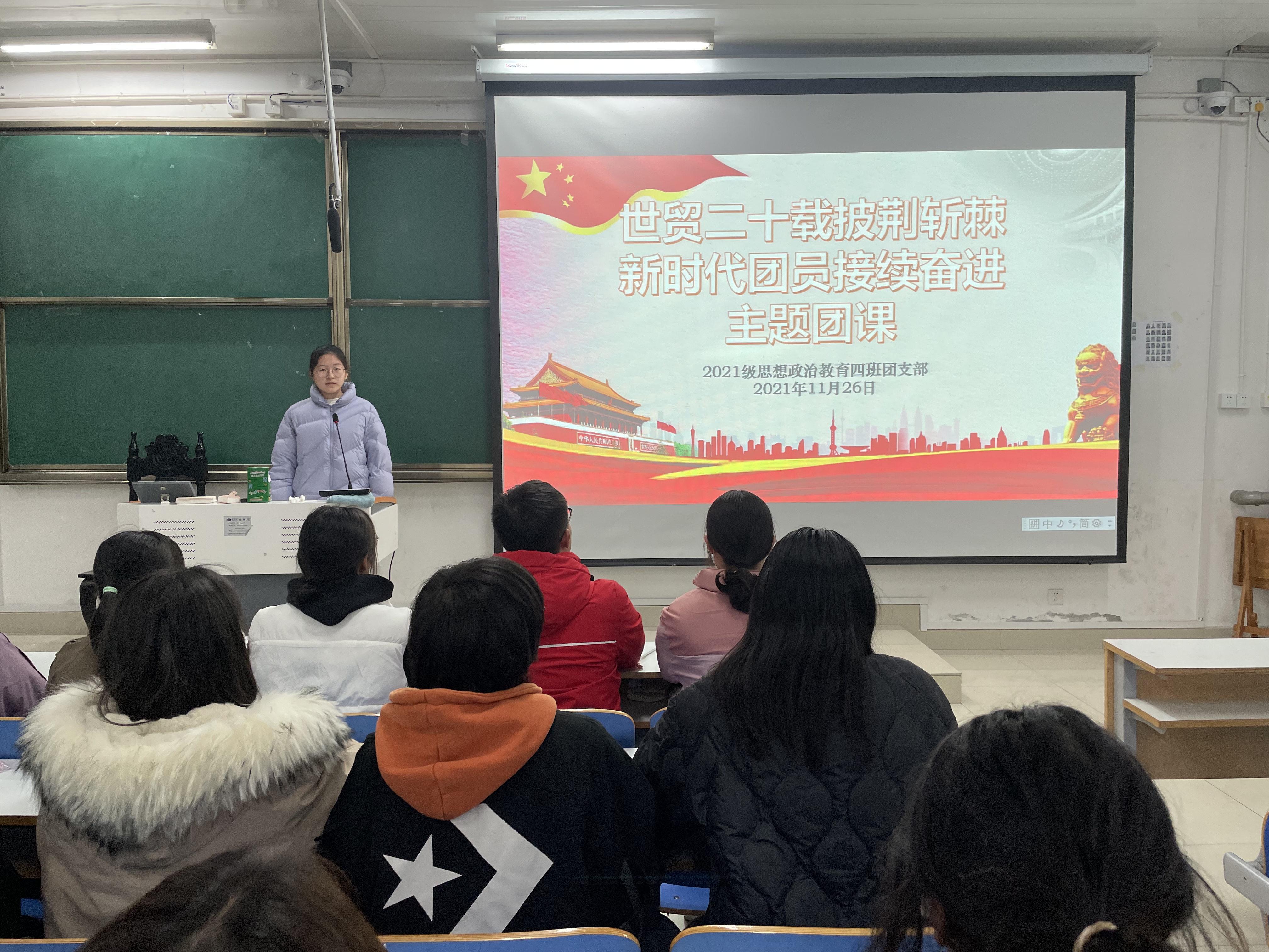 11月26日下午,金年会jinnianhuicom2021级思想政治教育四班在社科楼514召开“世贸二十载披荆斩棘,新时代团员接续奋进”主题团课。2021级思想政治教育四班全体团员参加本次主题团课,团课由团支书刘珂含主持。