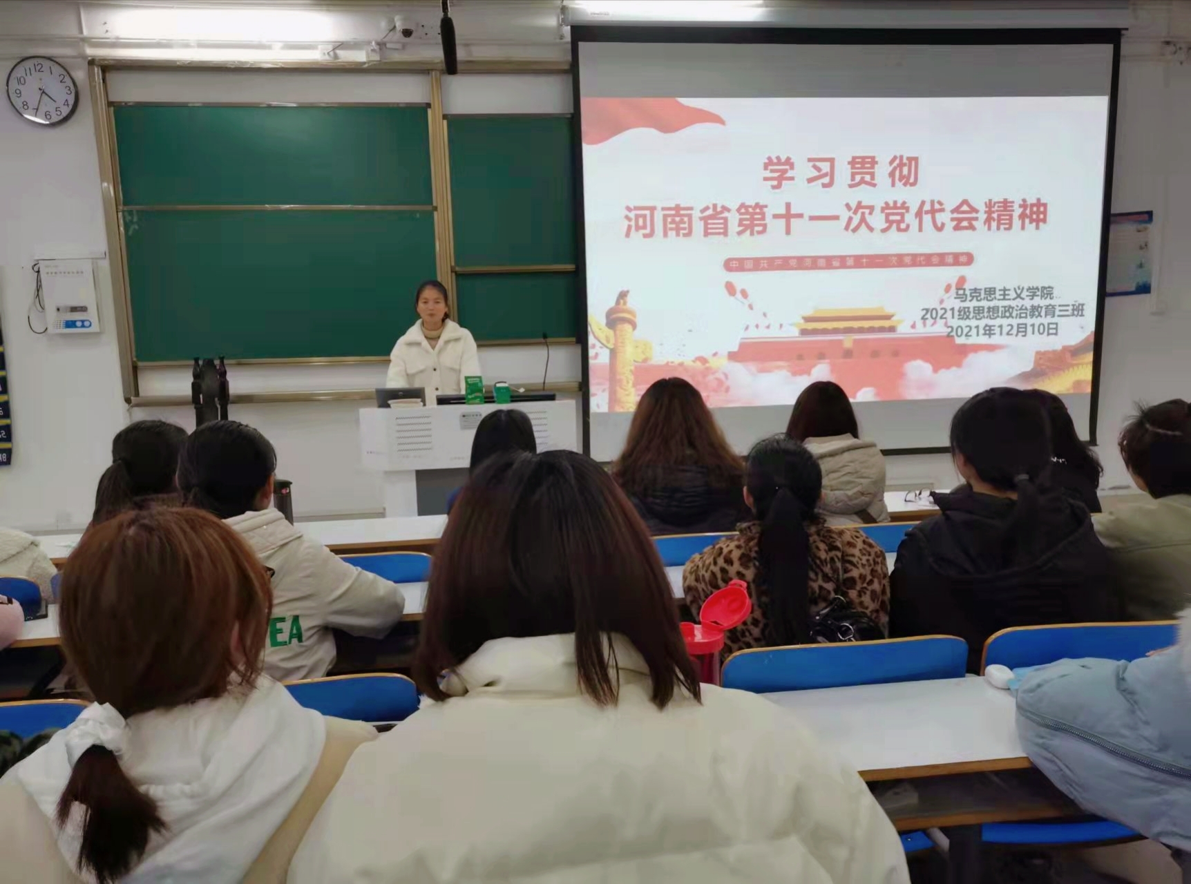 12月10日下午,金年会jinnianhuicom2021级思想政治教育三班在社科楼514教室举办“学习河南省第十一次党代会精神,争做新时代优秀团员”主题团课。2021级思想政治教育三班全体团员参加此次团课。团课由劳动委员易从漫主持。