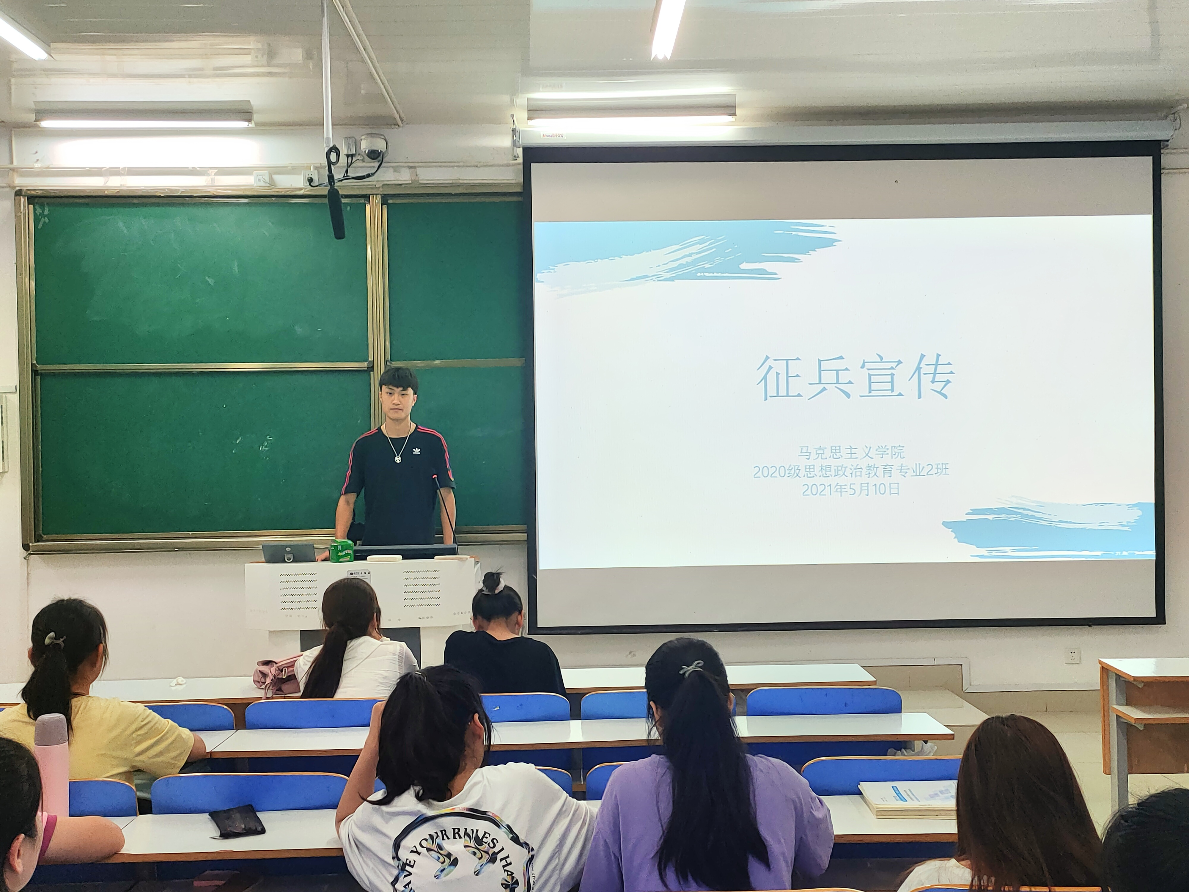 5月10日下午,金年会jinnianhuicom2020级思想政治教育二班、定向二班在社科楼514教室顺利召开征兵宣传主题班会。2020级思想政治教育二班、定向二班全体学生共同参与本次班会。班会由班长陈宇航主持。