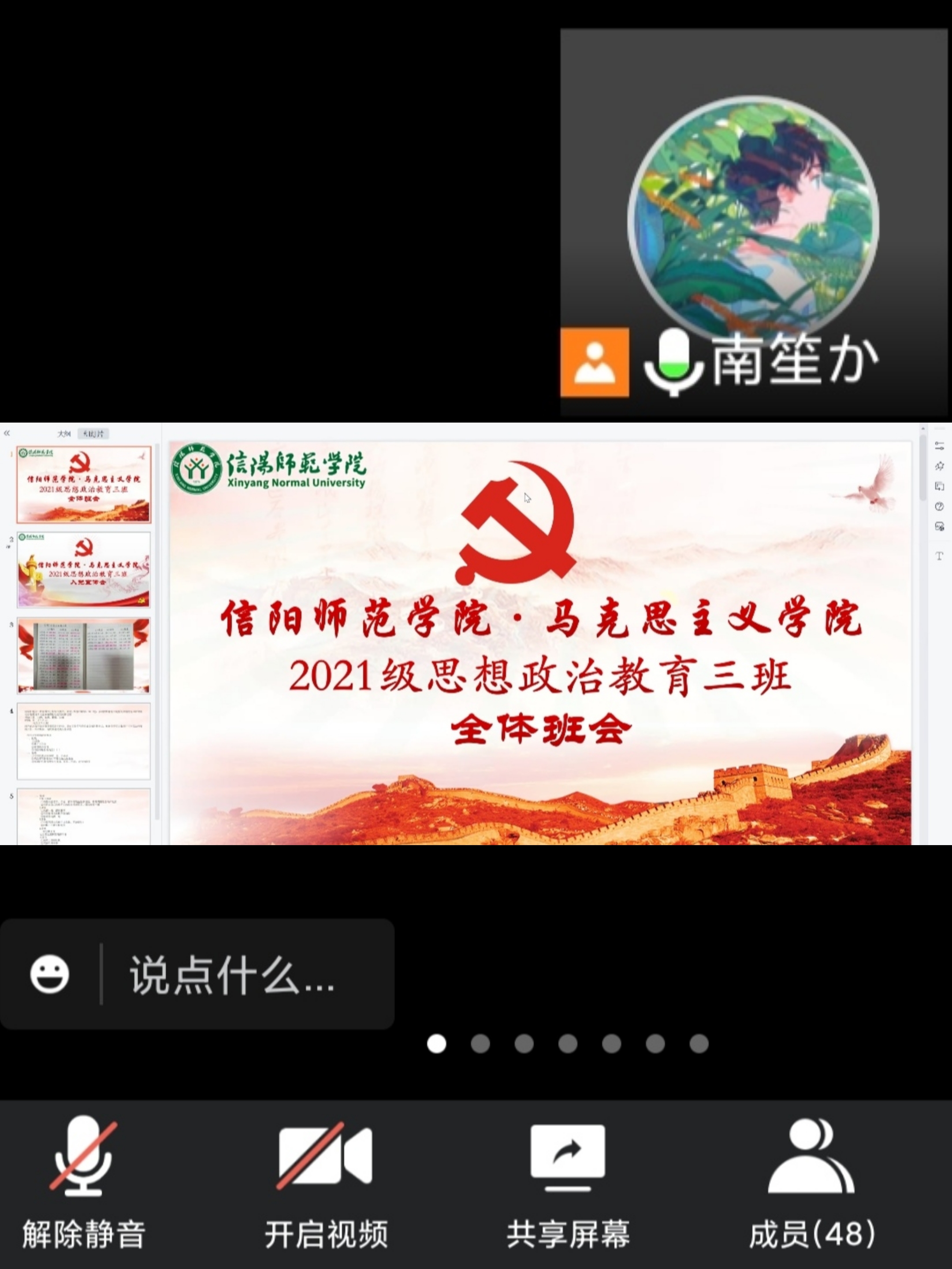 为增强同学们对入党的重视和调动同学们参与班务的积极性,10月14日晚上,金年会jinnianhuicom2021级思想政治教育三班入党宣传会暨全体班会在腾讯会议上顺利召开。金年会jinnianhuicom2021级思想政治教育三班全体同学共同参加,会议由团支书郭少华和副班长王岚霄主持。