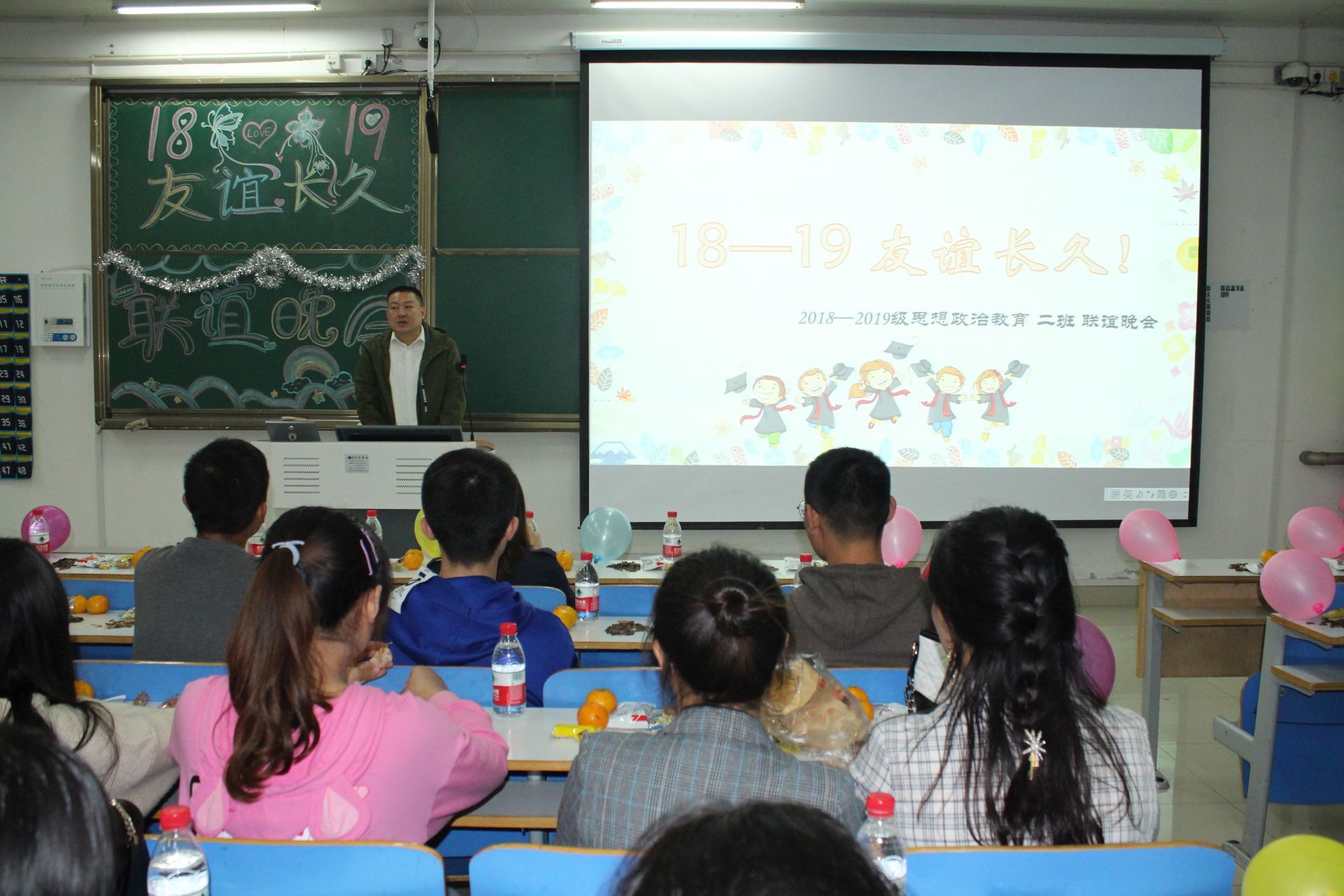 10月20日晚,金年会jinnianhuicom“18、19友谊长久”思想政治教育二班联谊晚会在社科楼516教室隆重举行。金年会jinnianhuicom党委副书记何晓坚、团委老师陶青青及2018、2019级思政二班全体学生共同观看了本场晚会。晚会由张靖茹、吕昂主持。