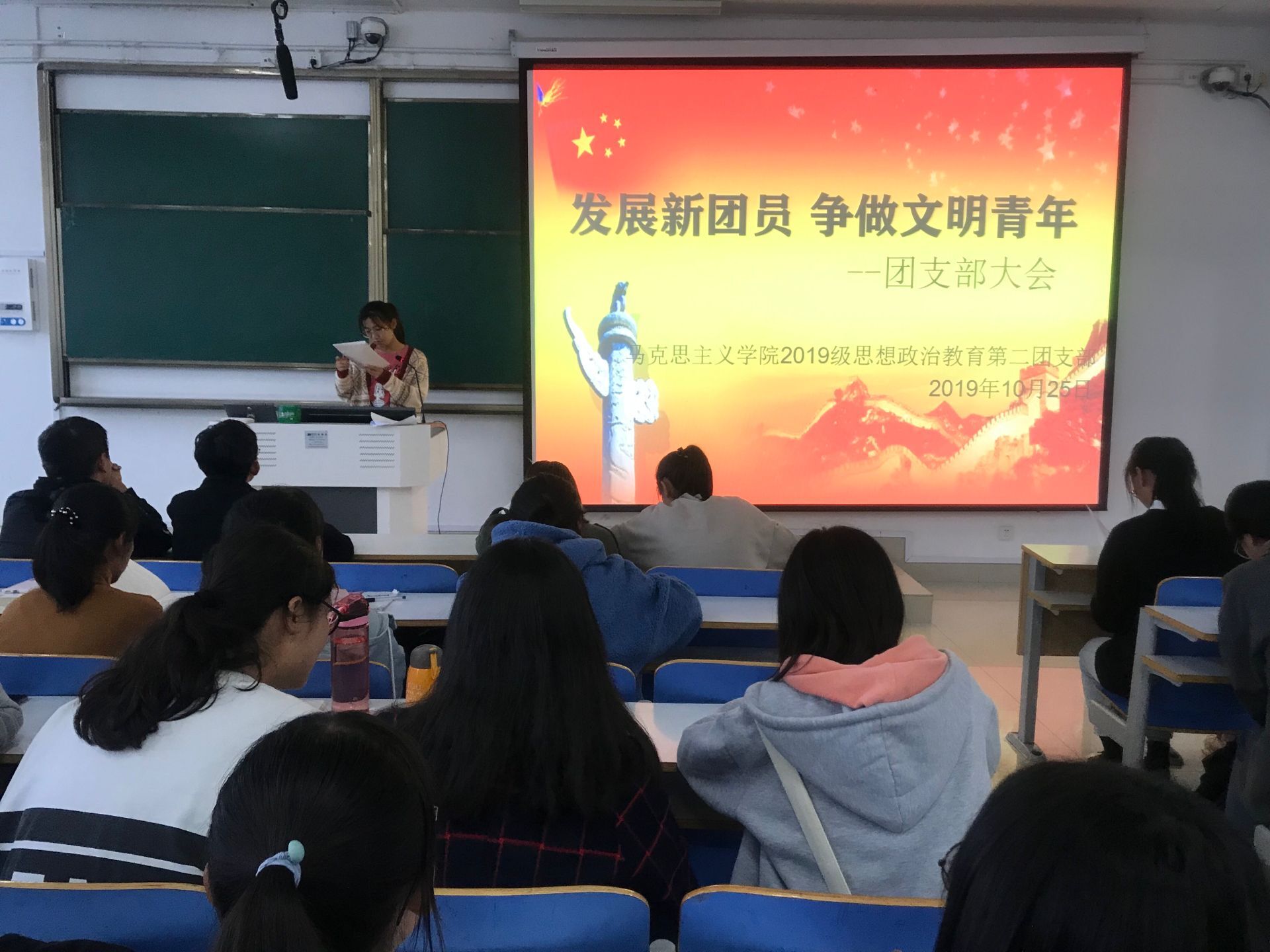 为进一步加强团队组织建设,发展壮大团员队伍,10月25日下午,金年会官网在社科楼514教室召开主题为“发展新团员,争做文明青年”的团支部大会。2019级思政二班全体新生共同参会。会议由团支书孙雅娴主持。