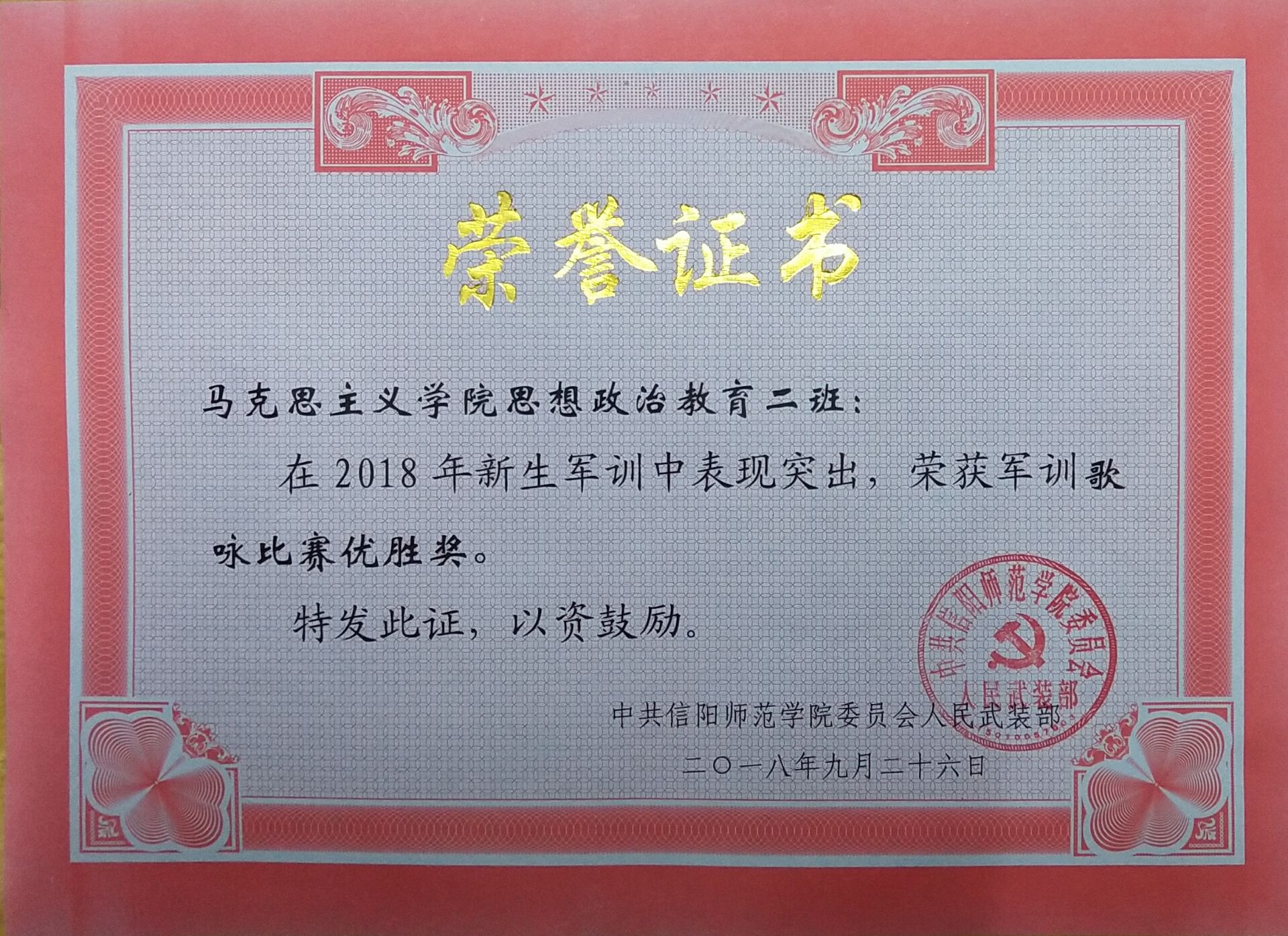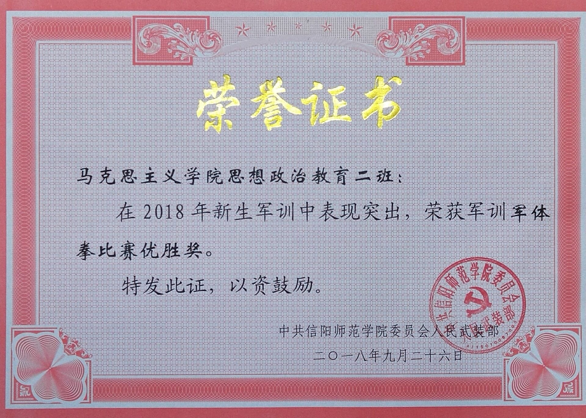 红旗猎猎,军歌嘹亮。9月26日上午,信阳师范学院2018级新生军训成果检验暨表彰大会在西操场召开。我校领导和教官们检阅了各军训方阵。在检阅过程中,由金年会官网的新生组成的军训受阅方队迈着整齐的步伐,喊着响亮的口号,个个军容整肃,雄姿英发,充分展示了2018级金年会jinnianhuicom新生昂扬向上的精神面貌。接着,全体2018级新生进行唱军歌、打军体拳等科目展示,展现了同学们的军训成果,尽显高昂士气。在表彰大会上,金年会jinnianhuicom2018级思想政治教育二班荣获军训歌咏比赛优胜奖和军体拳比赛优胜奖。除此,杨康、黄子晋被授予军训先进个人的称号。