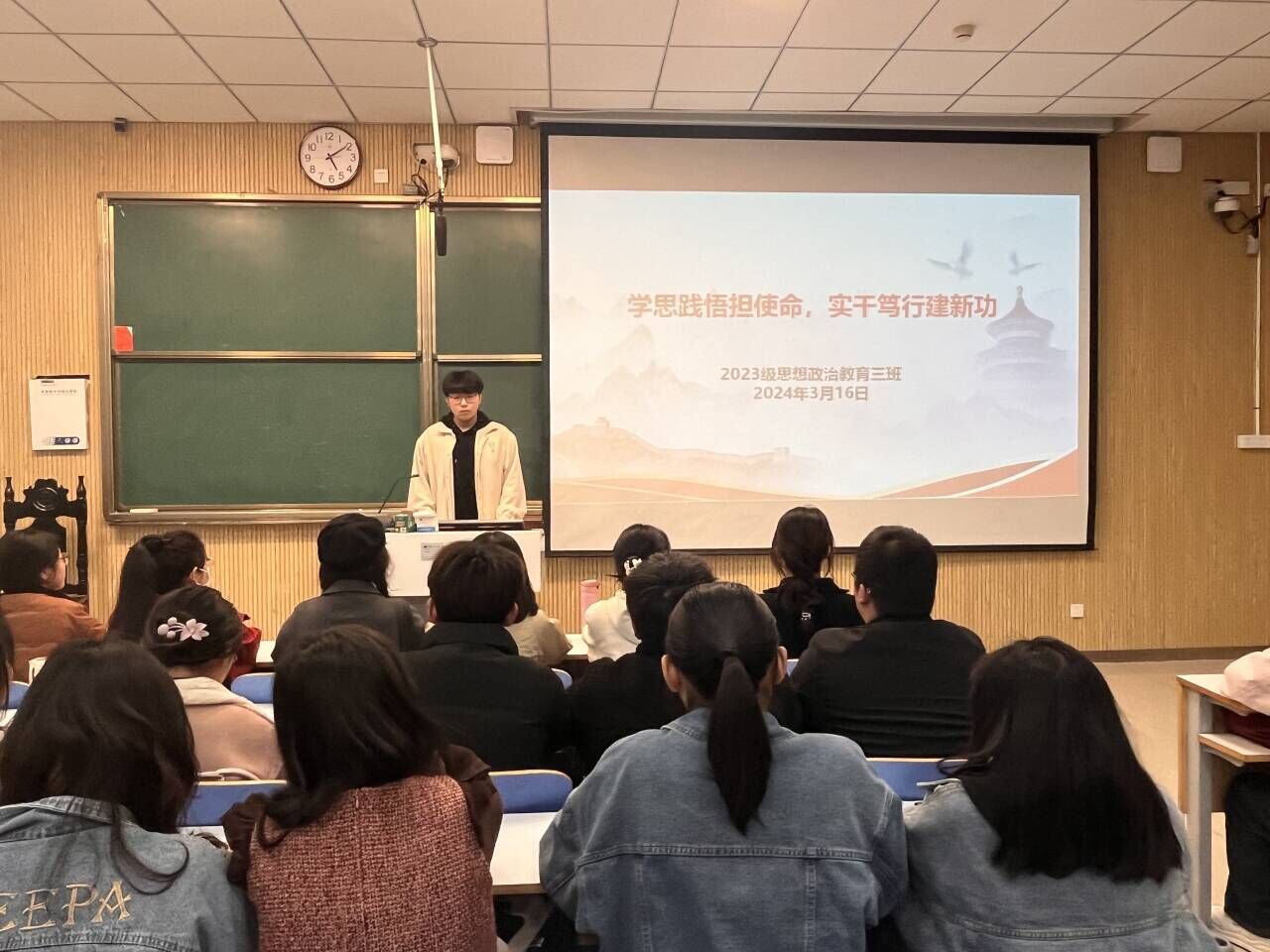 为深入学习贯彻习近平新时代中国特色社会主义思想,3月16日上午,金年会jinnianhuicom2023级思想政治教育三班在社科楼515教室召开“学思践悟担使命,实干笃行建新功”主题团课。金年会官网2023级思想政治教育三班全体同学共同参与本次班会,班会由团支书郝瀚主持。